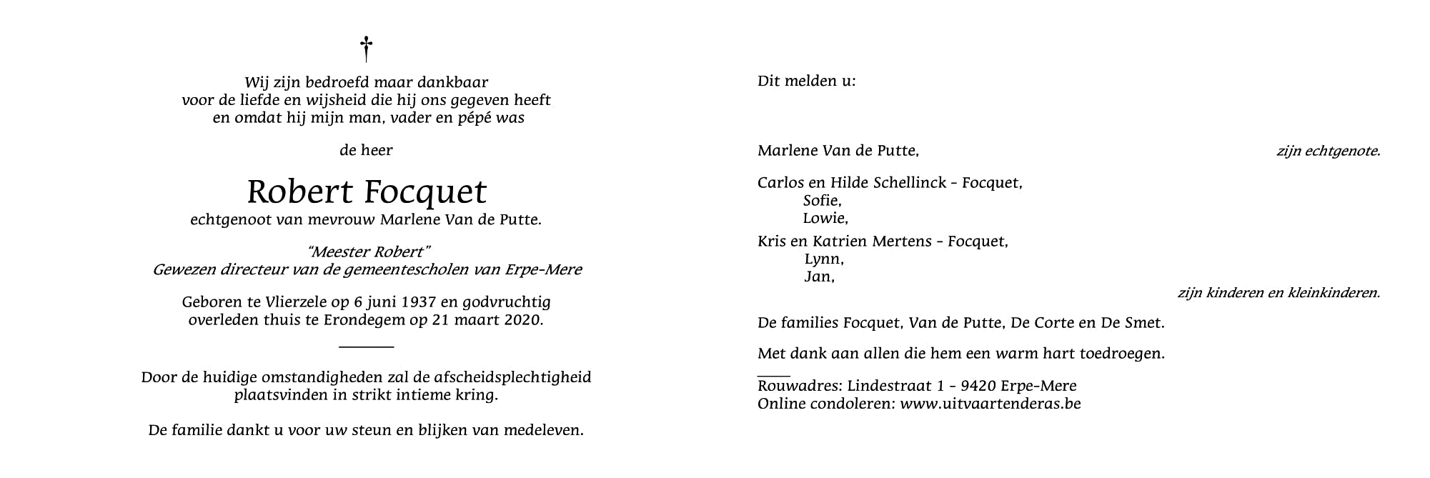 Robert Focquet Geboren: 6 juni 1937 — Vlierzele Overleden: 21 maart 2020 — Erondegem |