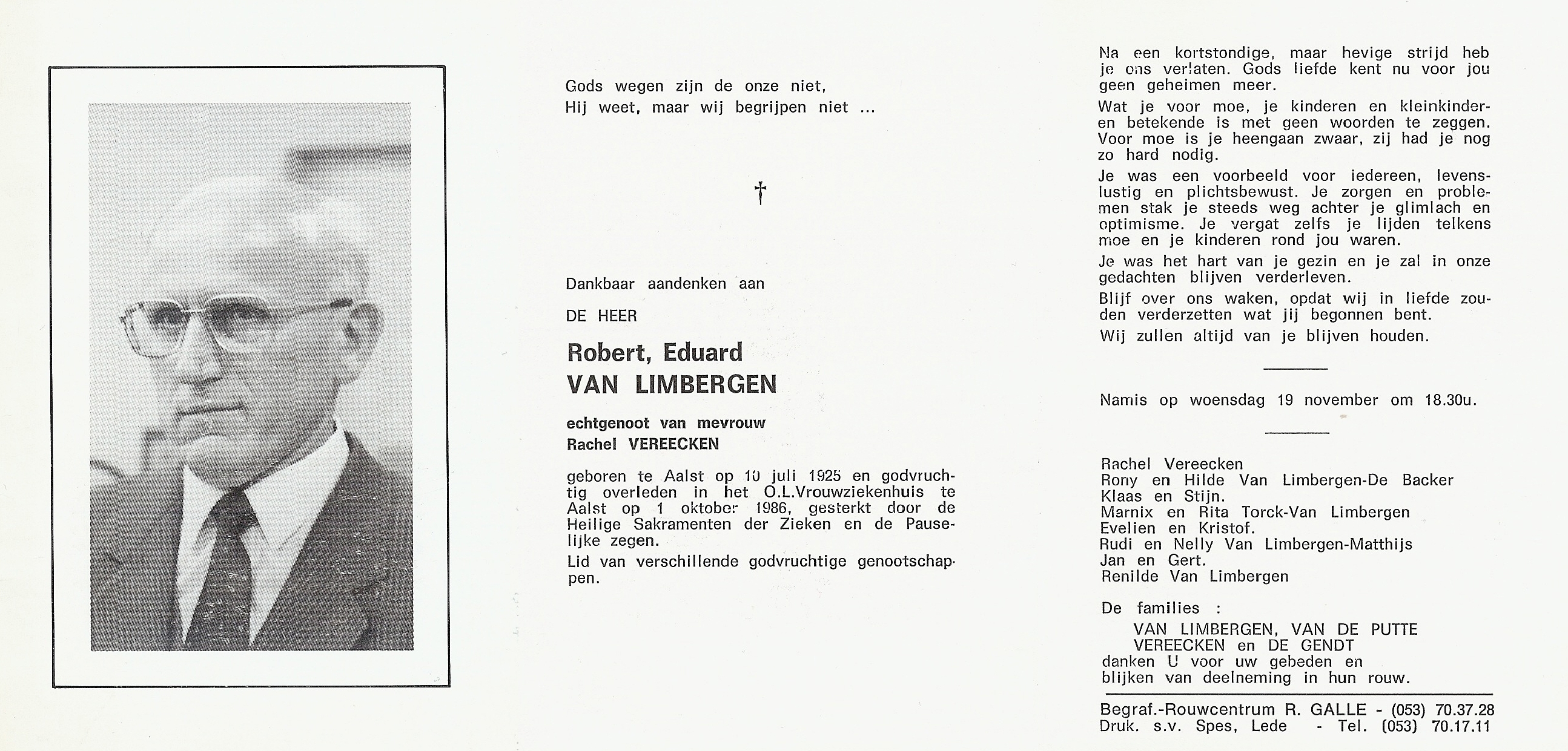 Overlijden van een echtgenoot | Robert Eduard Van Limbergen 1 oktober 1986 (Leeftijd 64 jaar) |