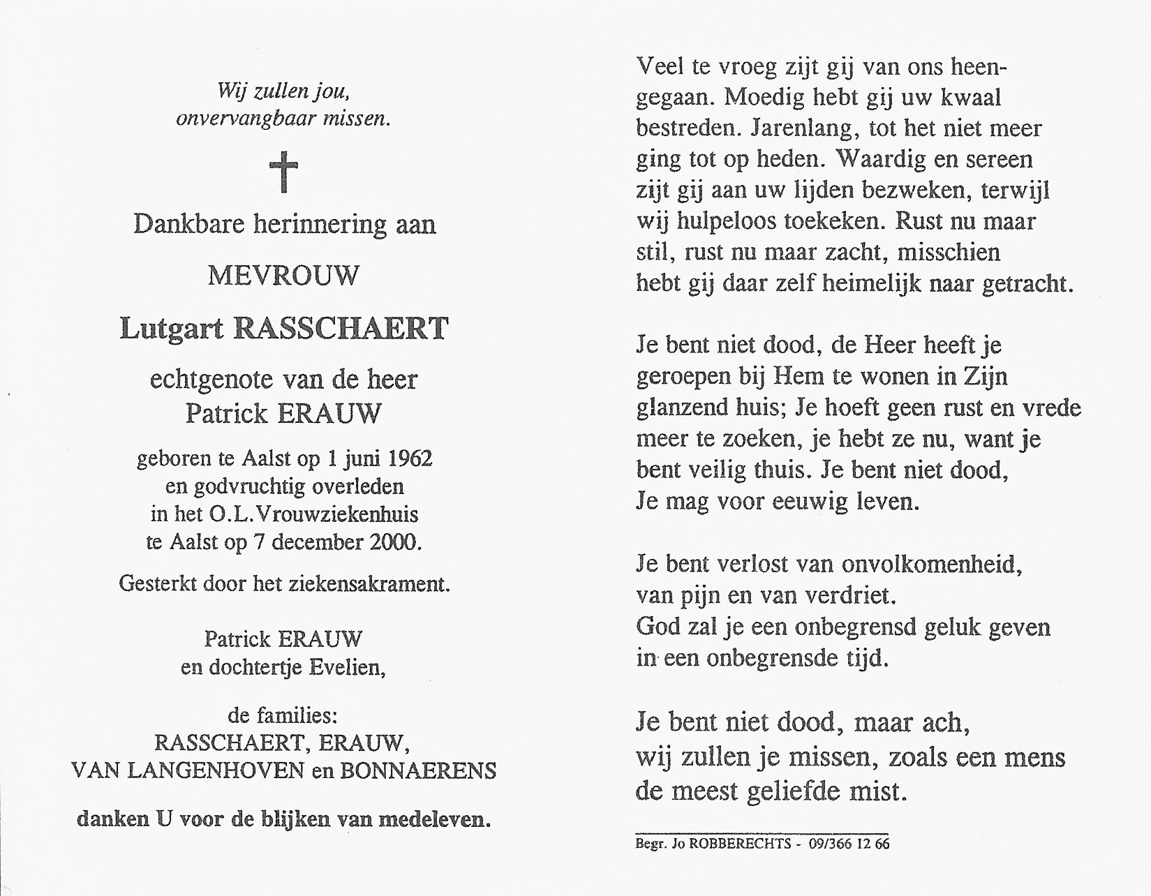 Lutgart Rasschaert Geboren: 1 juni 1962 28 29 — Aalst Overleden: 7 december 2000 — Aalst |
