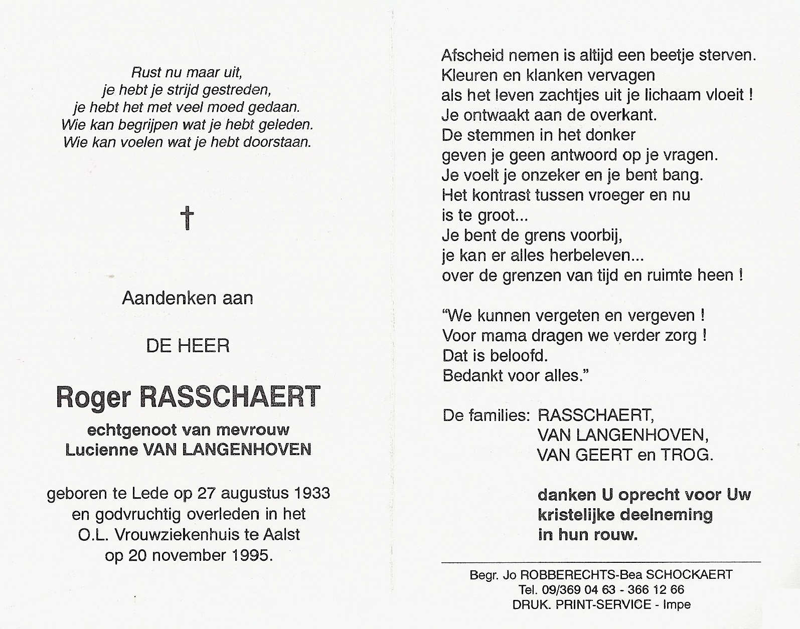 Roger Rasschaert Geboren: 27 augustus 1933 — Lede Overleden: 20 november 1995 — Aalst |