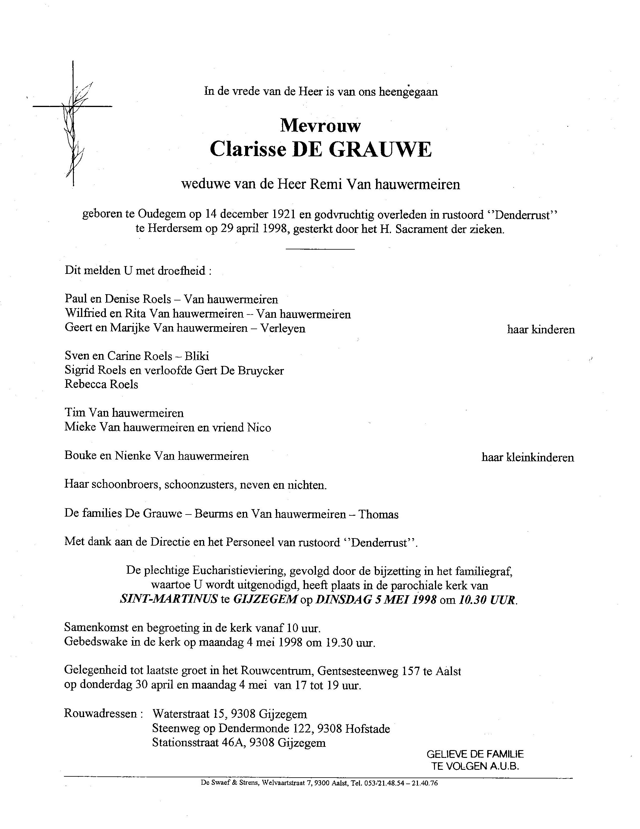 Clarisse De Grauwe Geboren: 14 december 1921 — Oudegem Overleden: 29 april 1998 — Herdersem |