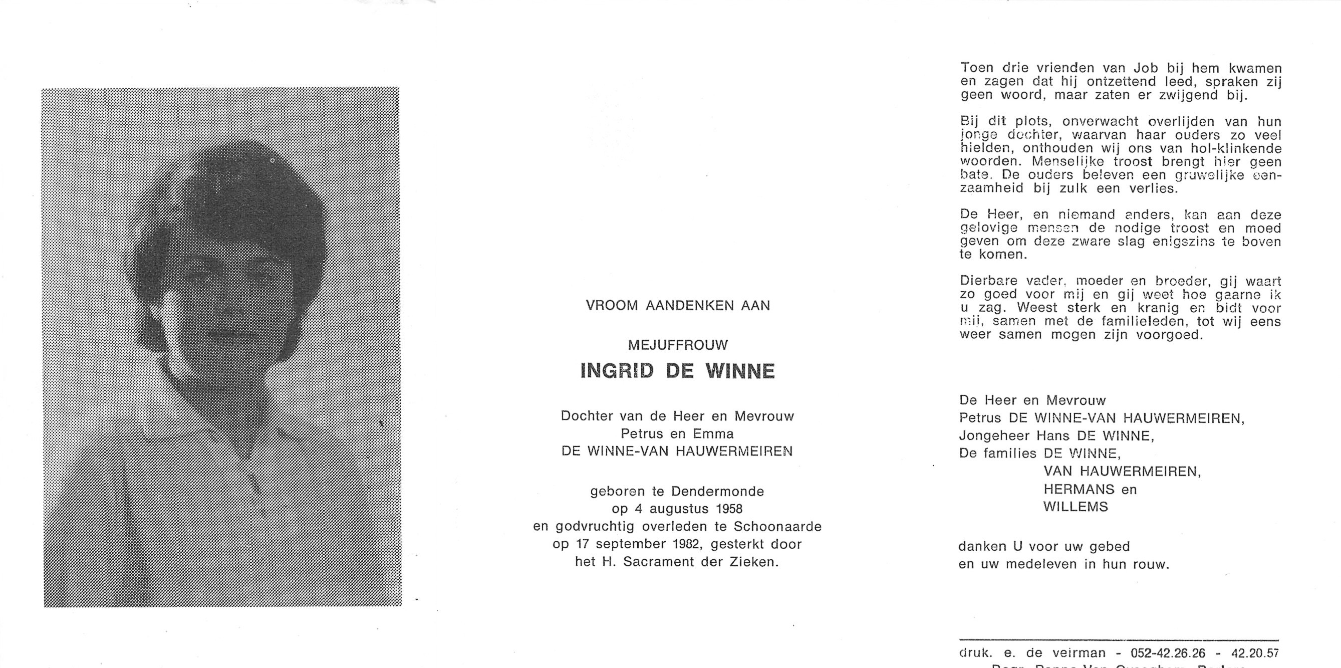 Ingrid Regina Victorine De Winne Geboren: 4 augustus 1958 29 27 — Dendermonde Overleden: 17 september 1982 — Schoonaarde |