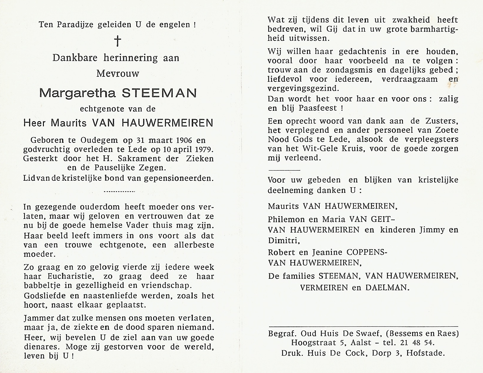 Margaretha Steeman Geboren: 31 maart 1906 — Oudegem Overleden: 10 april 1979 — Lede |