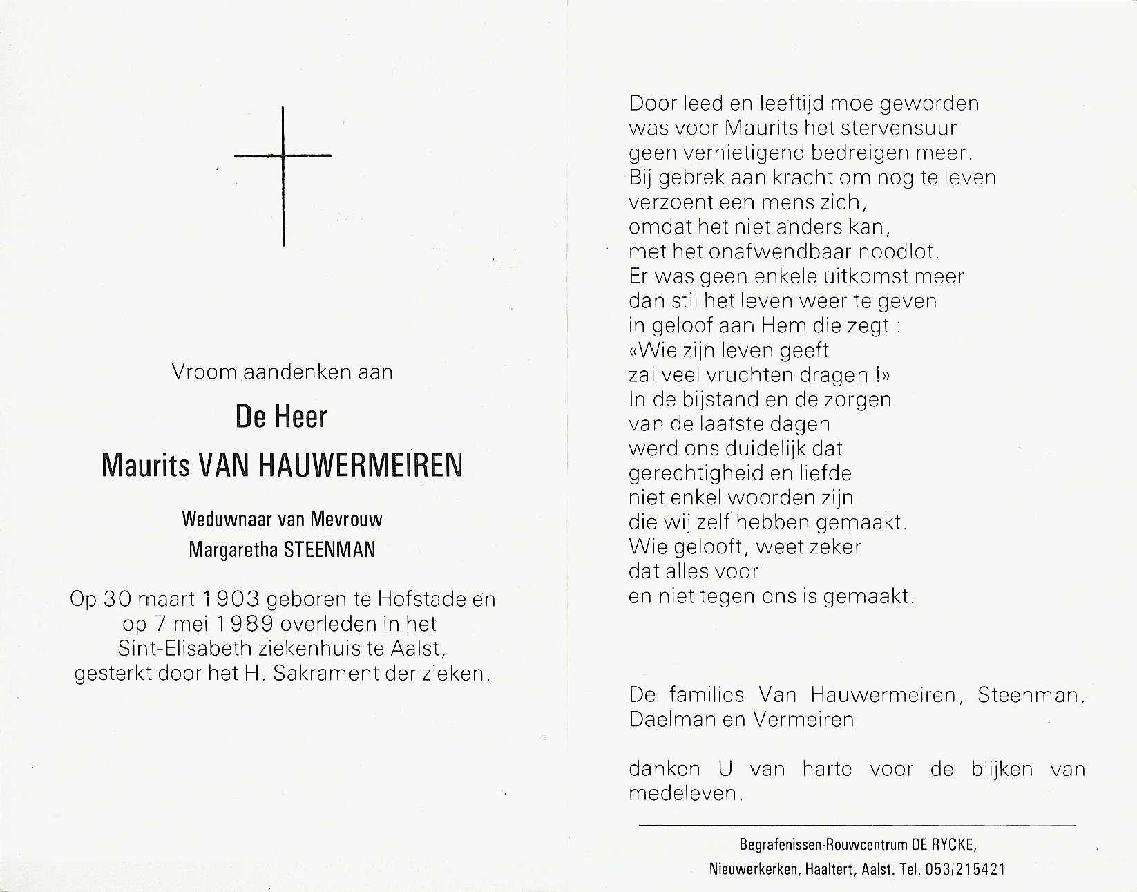Overlijden van een broer | Maurits Van Hauwermeiren 7 mei 1989 (Leeftijd 78 jaar) |