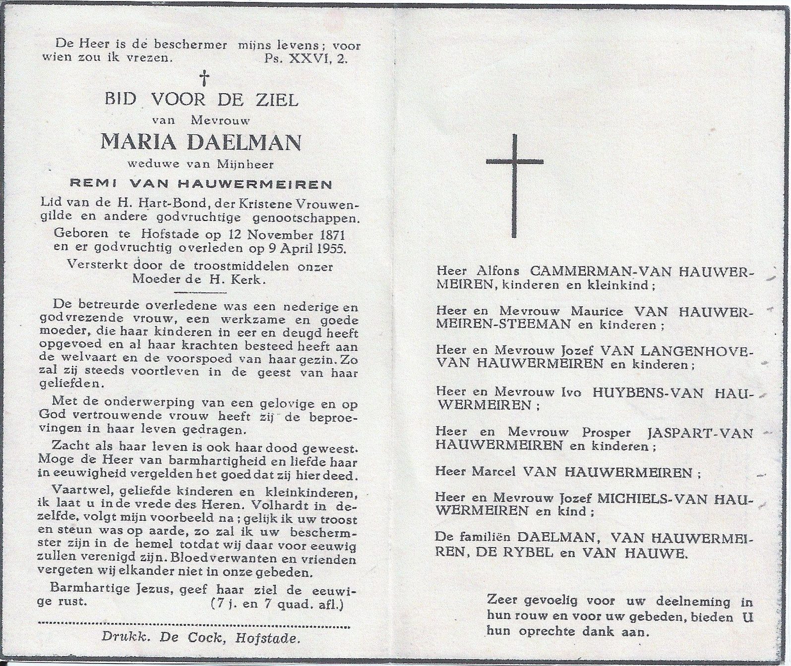 Maria Francisca Daelman Geboren: 12 november 1871 — Hofstade Overleden: 9 april 1955 — Hofstade |