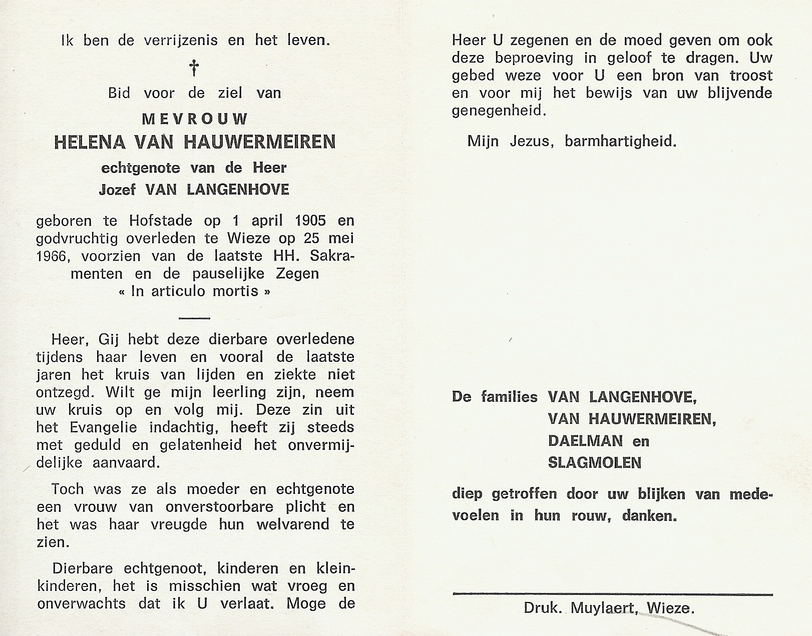 Helena Van Hauwermeiren Geboren: 1 april 1905 34 33 — Hofstade Overleden: 25 mei 1966 — Wieze |