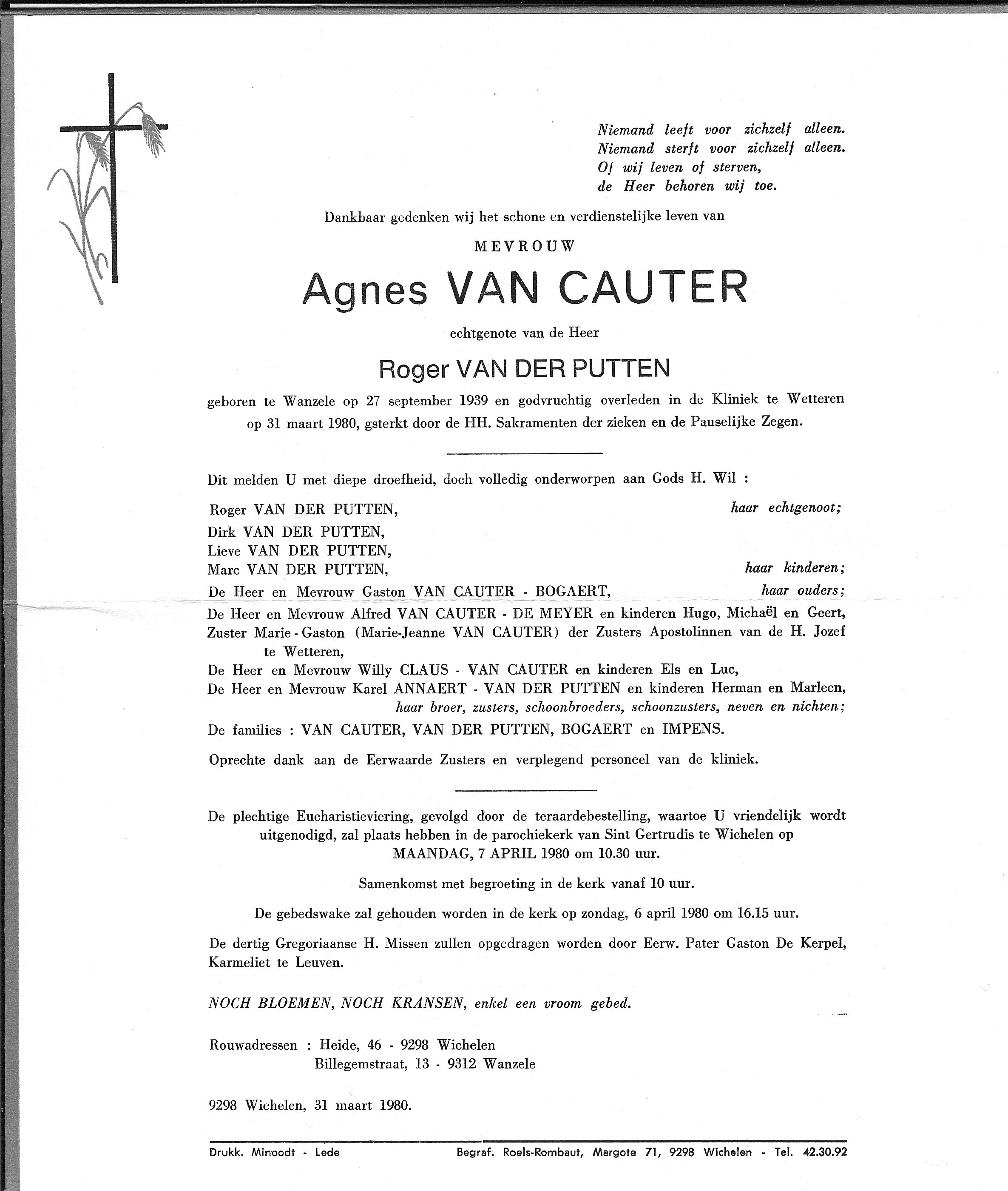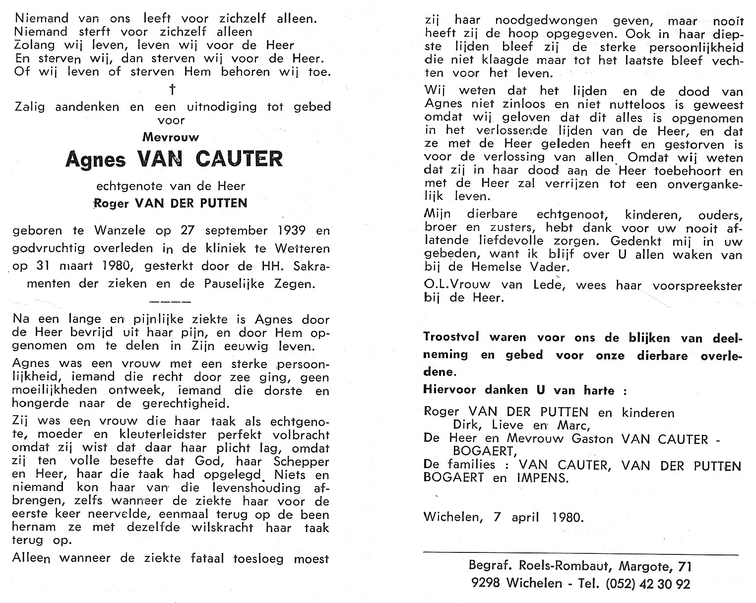 Begrafenis van een echtgenote | Agnes Maria Van Cauter 7 april 1980 (Leeftijd 47 jaar) |