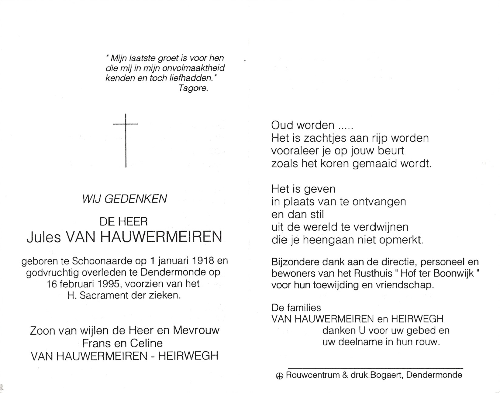 Jules Van Hauwermeiren Geboren: 1 januari 1918 33 37 — Schoonaarde Overleden: 16 februari 1995 — Dendermonde |
