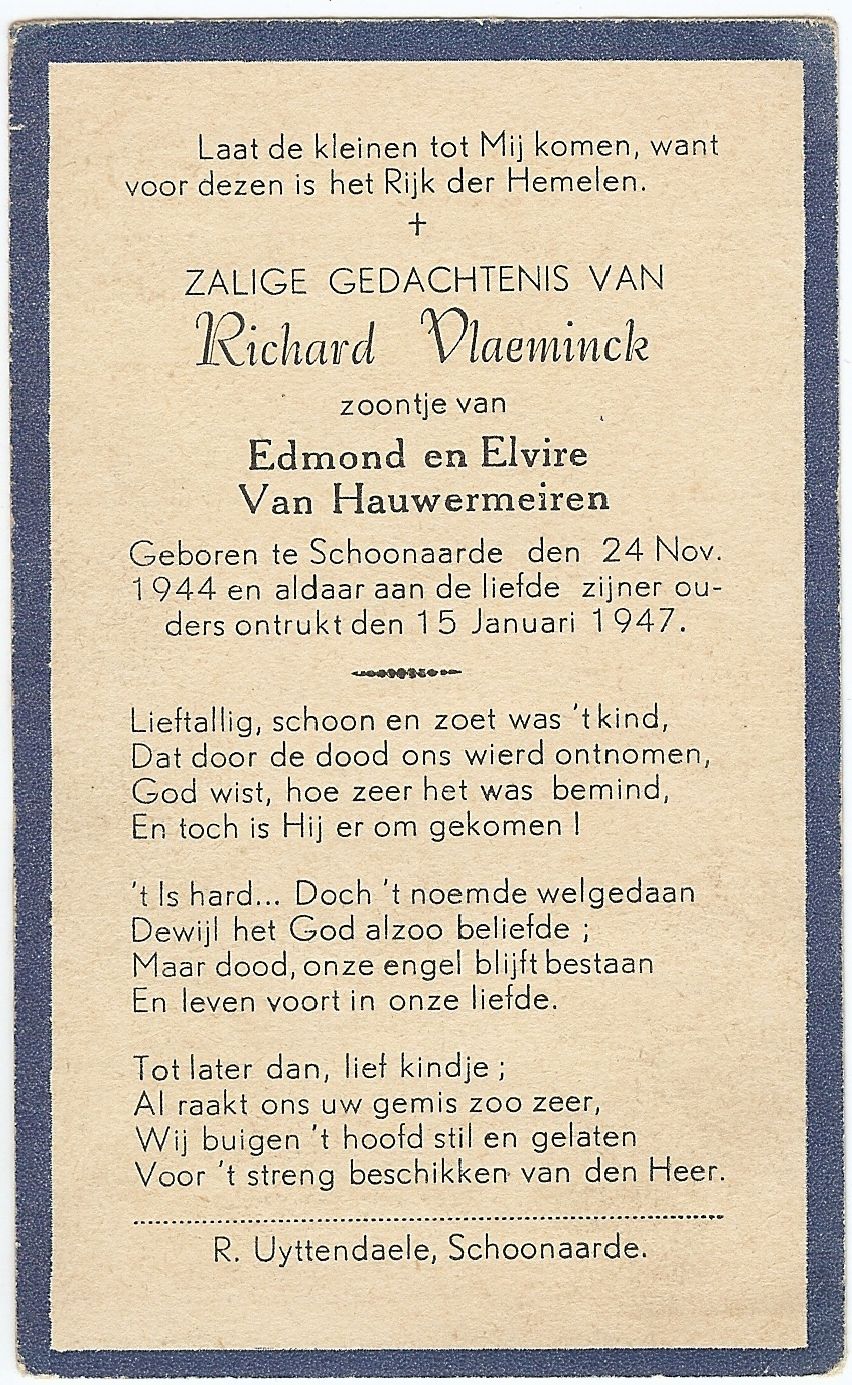Richard Vlaeminck Geboren: 24 november 1944 30 29 — Schoonaarde Overleden: 15 januari 1947 — Schoonaarde |