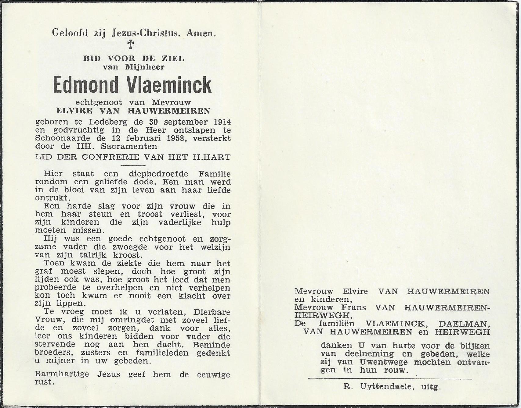 Overlijden van een echtgenoot | Edmond Vlaeminck 12 februari 1958 (Leeftijd 42 jaar) |