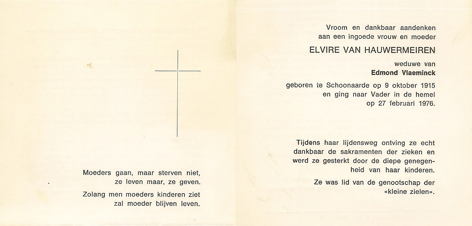 Overlijden van moeder | Elvire Van Hauwermeiren 27 februari 1976 |