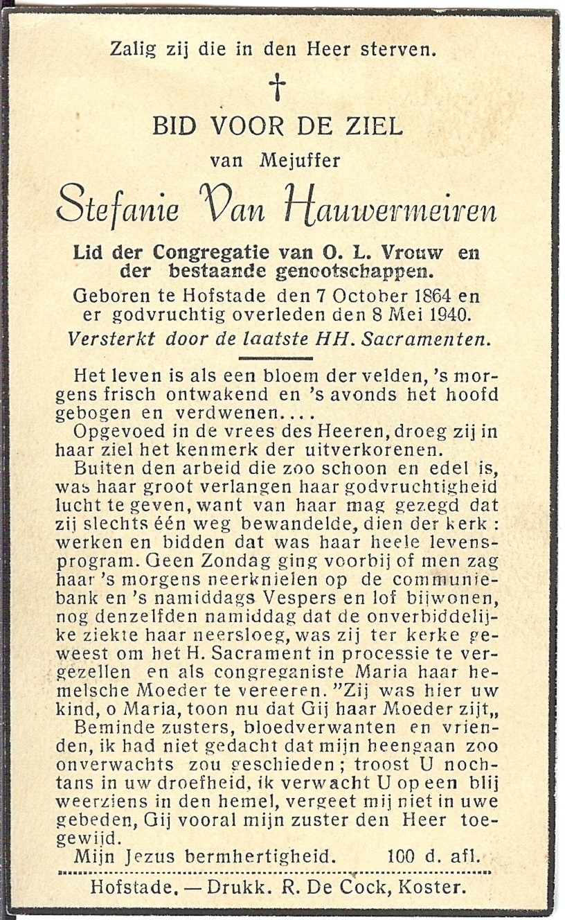 Stephania Van Hauwermeiren Geboren: 7 oktober 1864 38 34 — Hofstade Overleden: 8 mei 1940 — Hofstade |