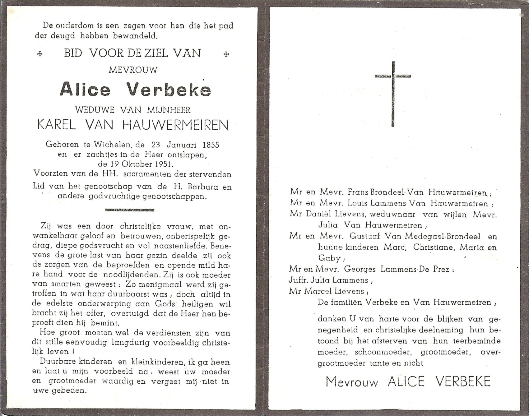 Maria-Alina Van Hauwermeiren Geboren: 16 april 1889 36 34 — Wichelen Overleden: 27 december 1963 — Wichelen |