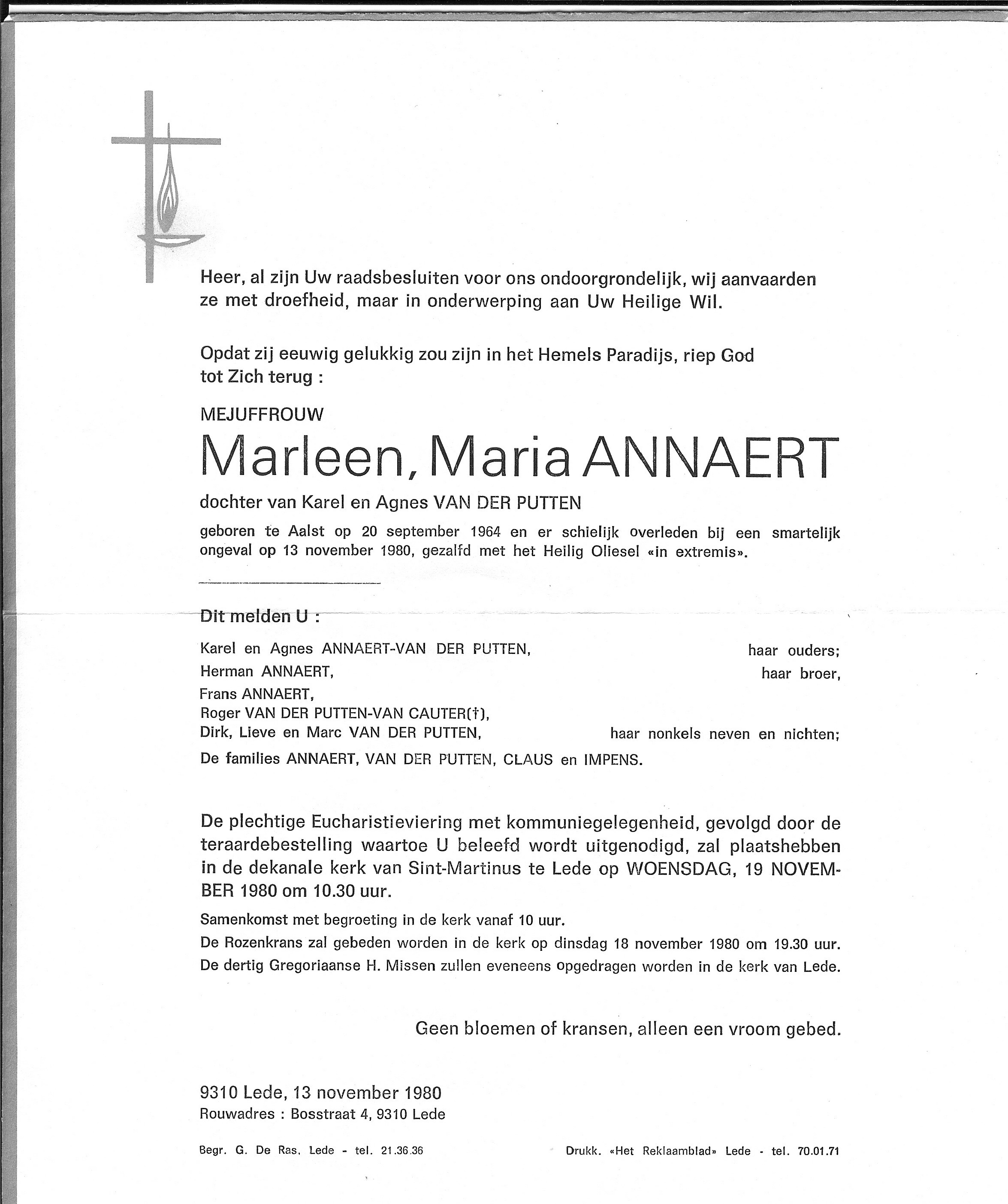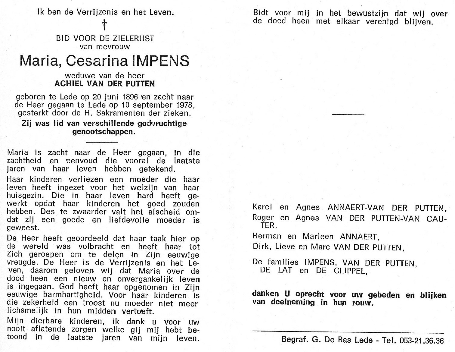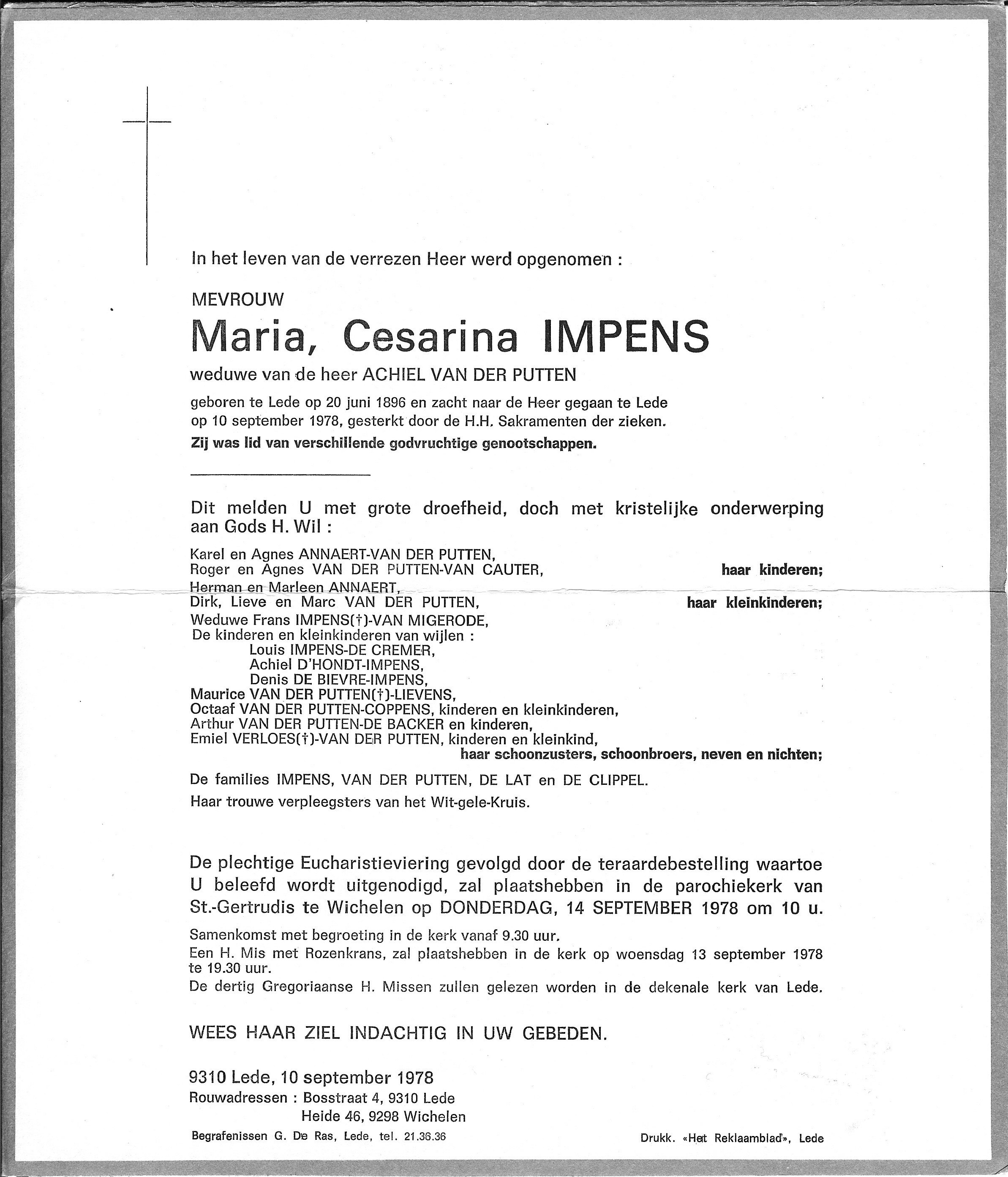 Begrafenis van grootmoeder van moeders kant | Maria Cesarina Renilde Impens 14 september 1978 (Leeftijd 13 jaar) |