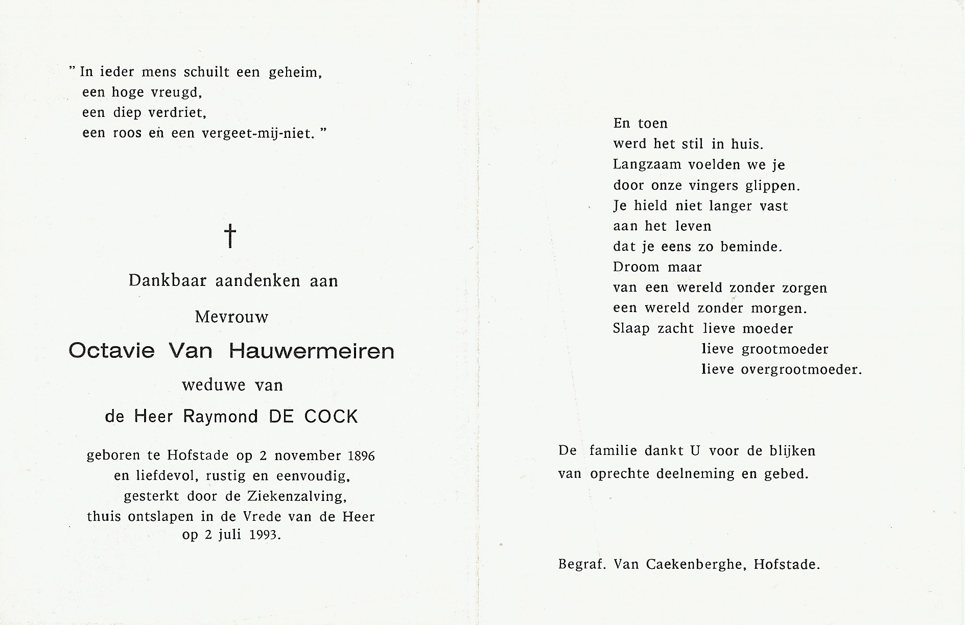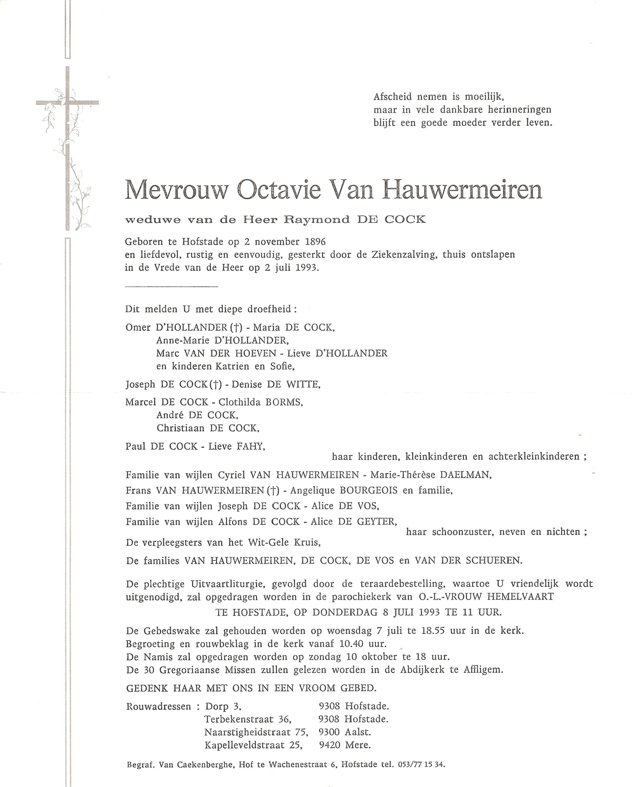 Octavie Josephina Van Hauwermeiren Geboren: 2 november 1896 54 40 — Hofstade Overleden: 2 juli 1993 — Hofstade |
