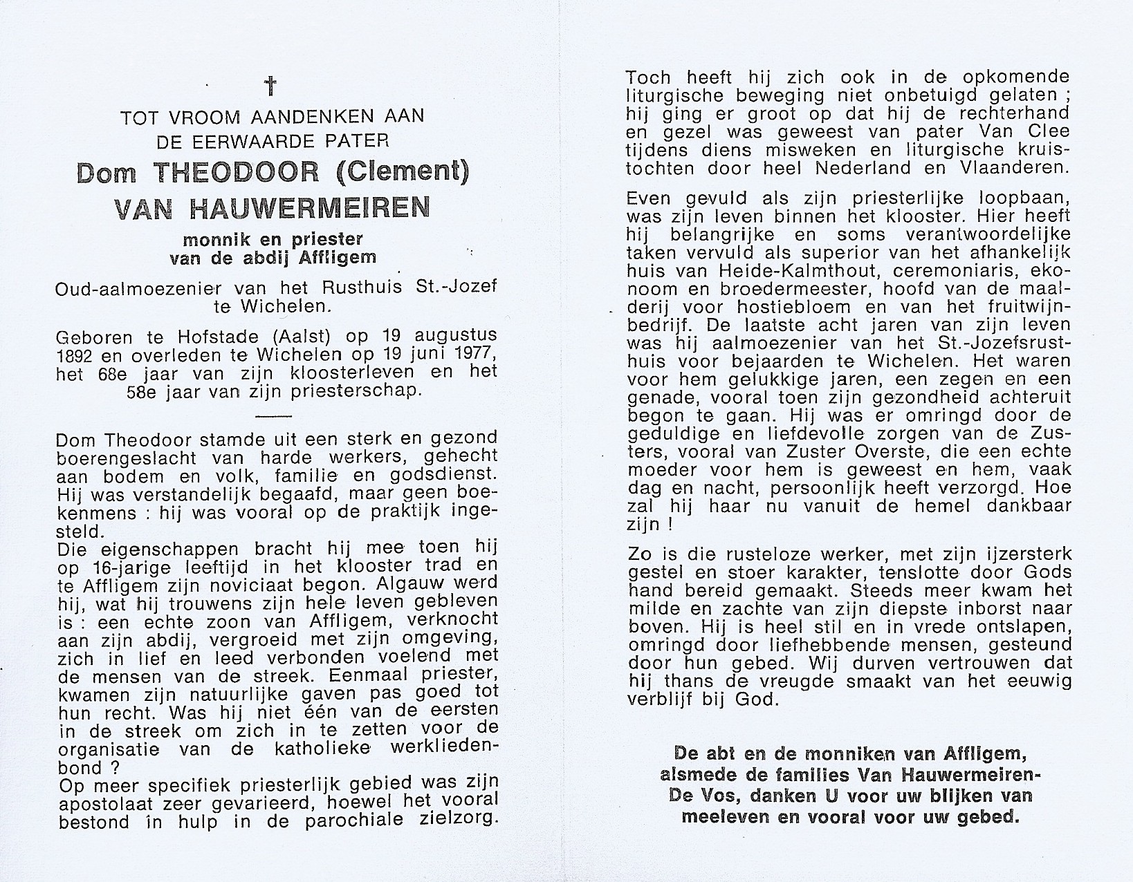 Overlijden van een broer | Charles Clement Van Hauwermeiren 19 juni 1977 (Leeftijd 80 jaar) |
