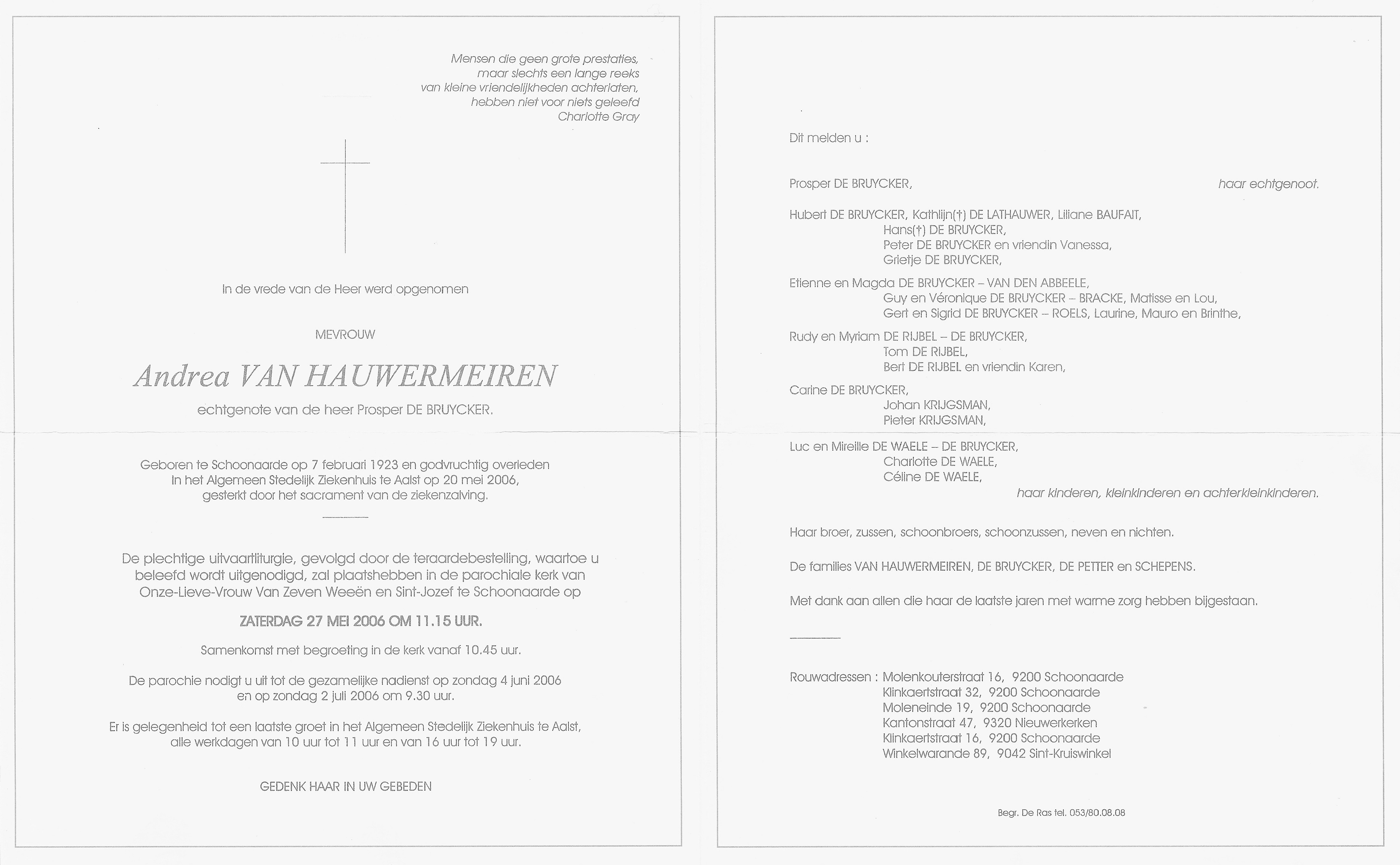 Overlijden van een broer | Prudent Alfons André Van Hauwermeiren 17 februari 2006 (Leeftijd 83 jaar) |