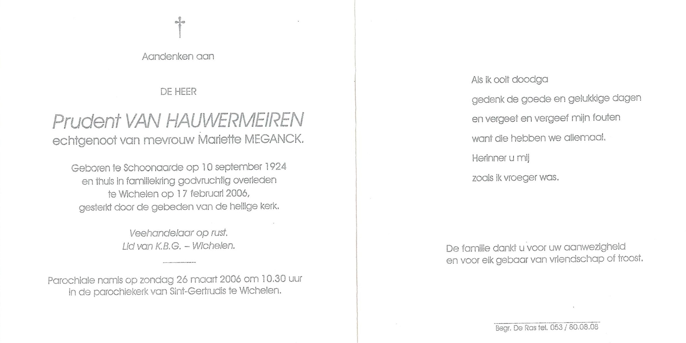 Prudent Alfons André Van Hauwermeiren Geboren: 10 september 1924 33 28 — Schoonaarde Overleden: 17 februari 2006 — Wichelen |
