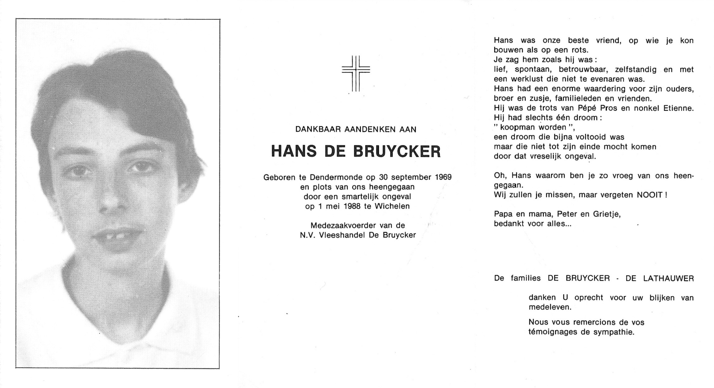 Overlijden van een kleinzoon | Hans De Bruycker 1 mei 1988 (Leeftijd 65 jaar) |