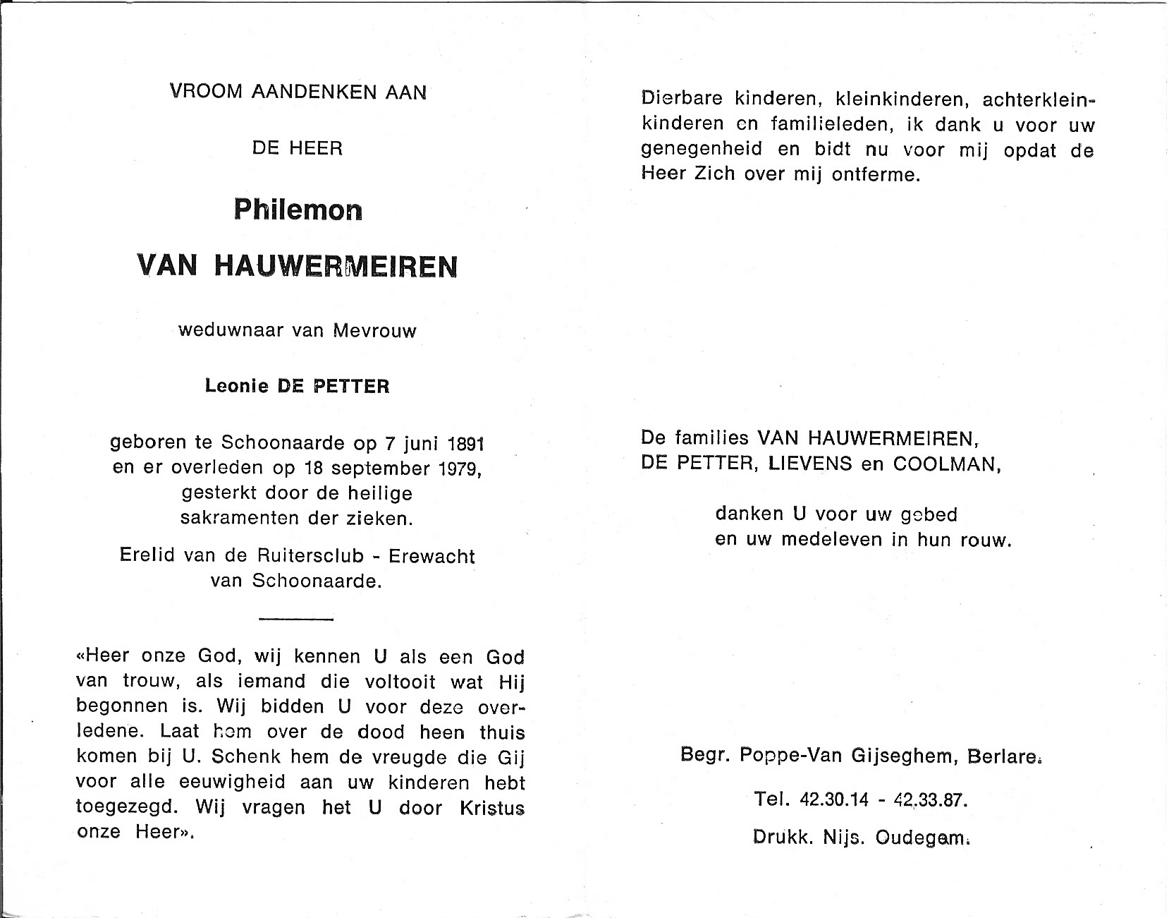Begrafenis van vader | Philemon Clemens Van Hauwermeiren 24 september 1979 (Leeftijd 56 jaar) |