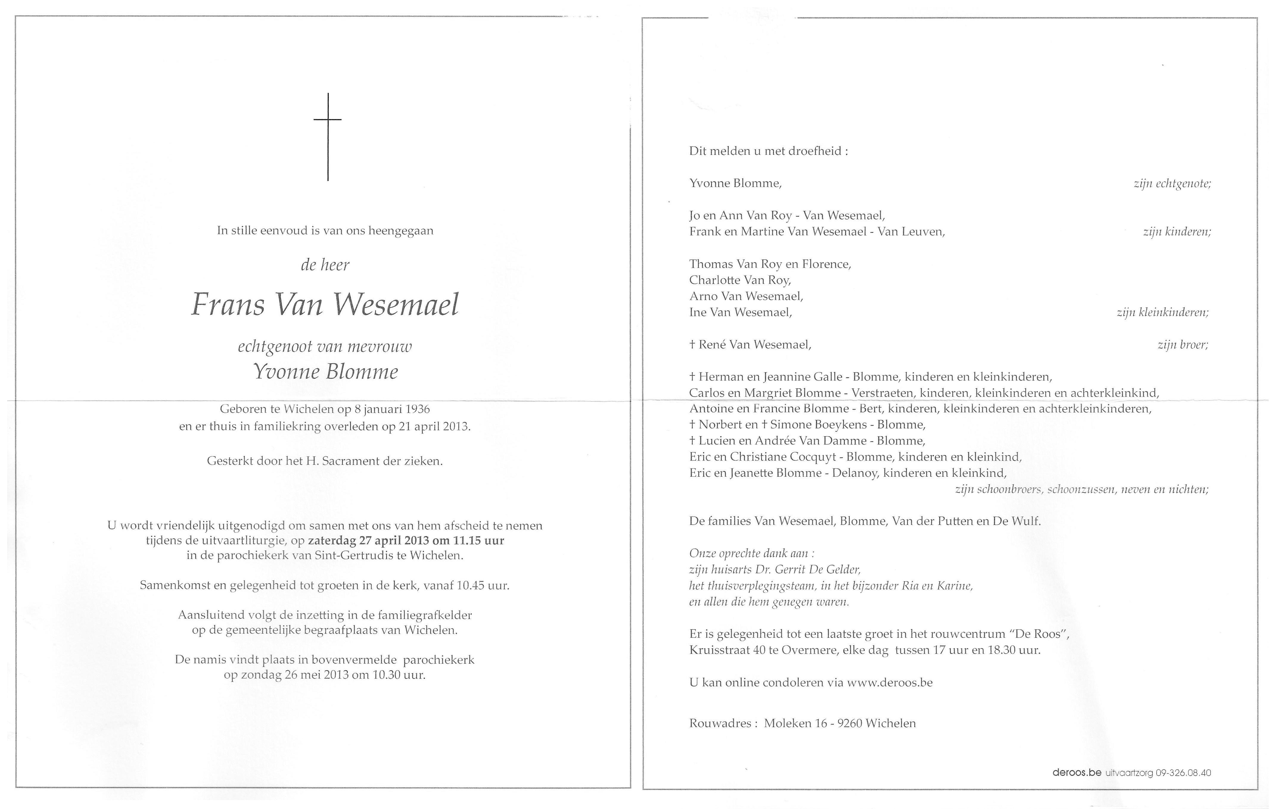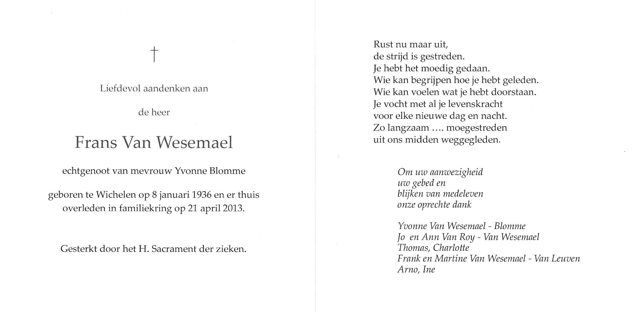 Frans Van WesemaelLeeftijd: 76 jaar1936–2013
