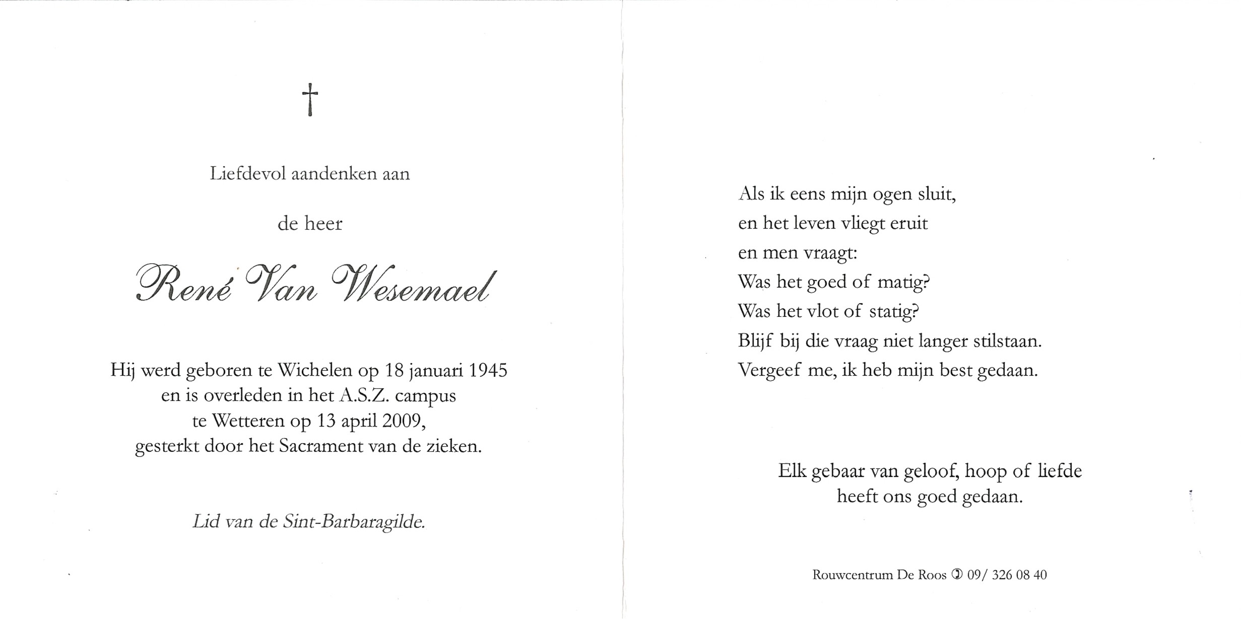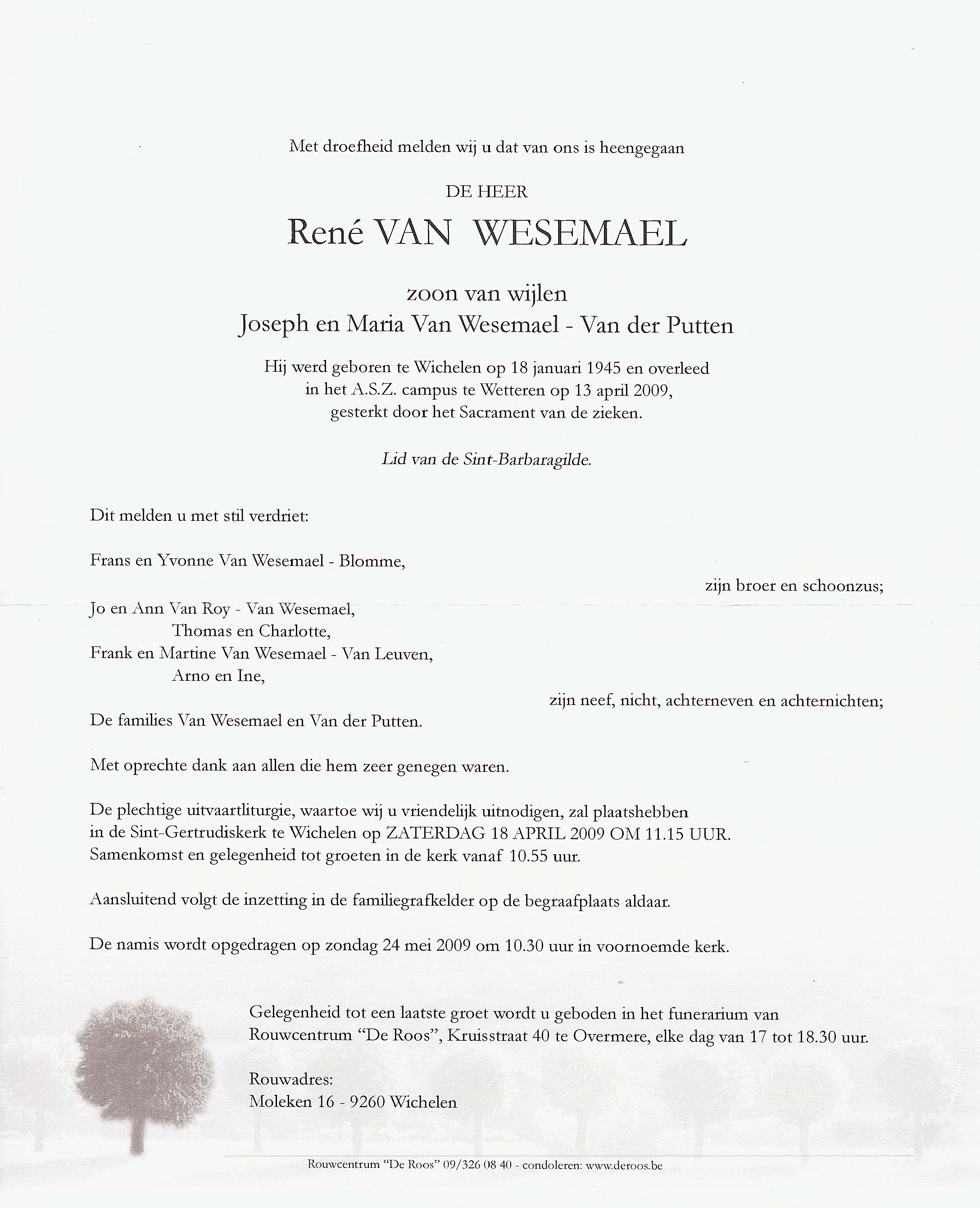 Begrafenis van een broer | Rene Van Wesemael 18 april 2009 (Leeftijd 72 jaar) |
