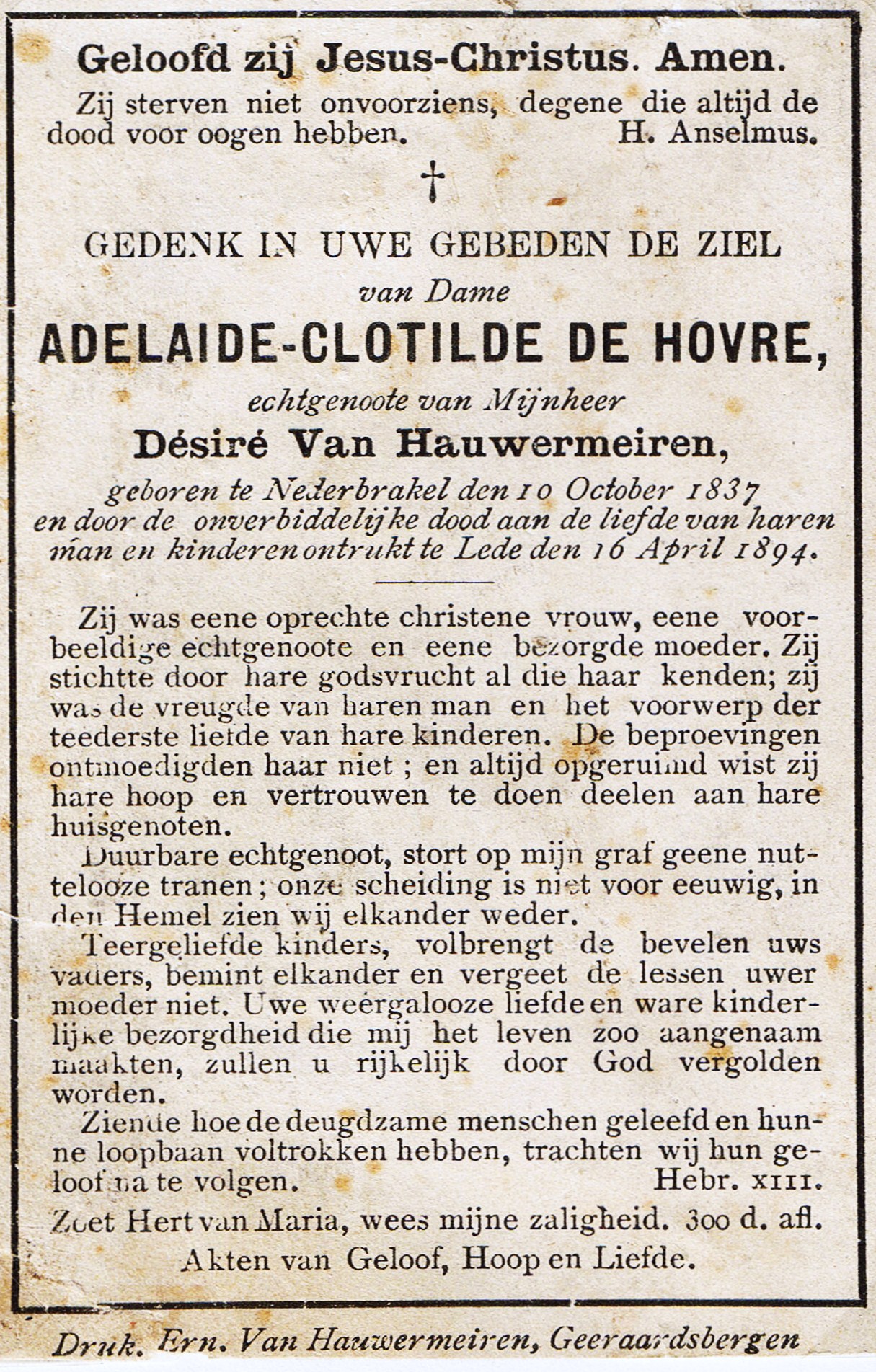 Overlijden van moeder | Adelaide De Hovre 16 april 1894 (Leeftijd 27 jaar) |