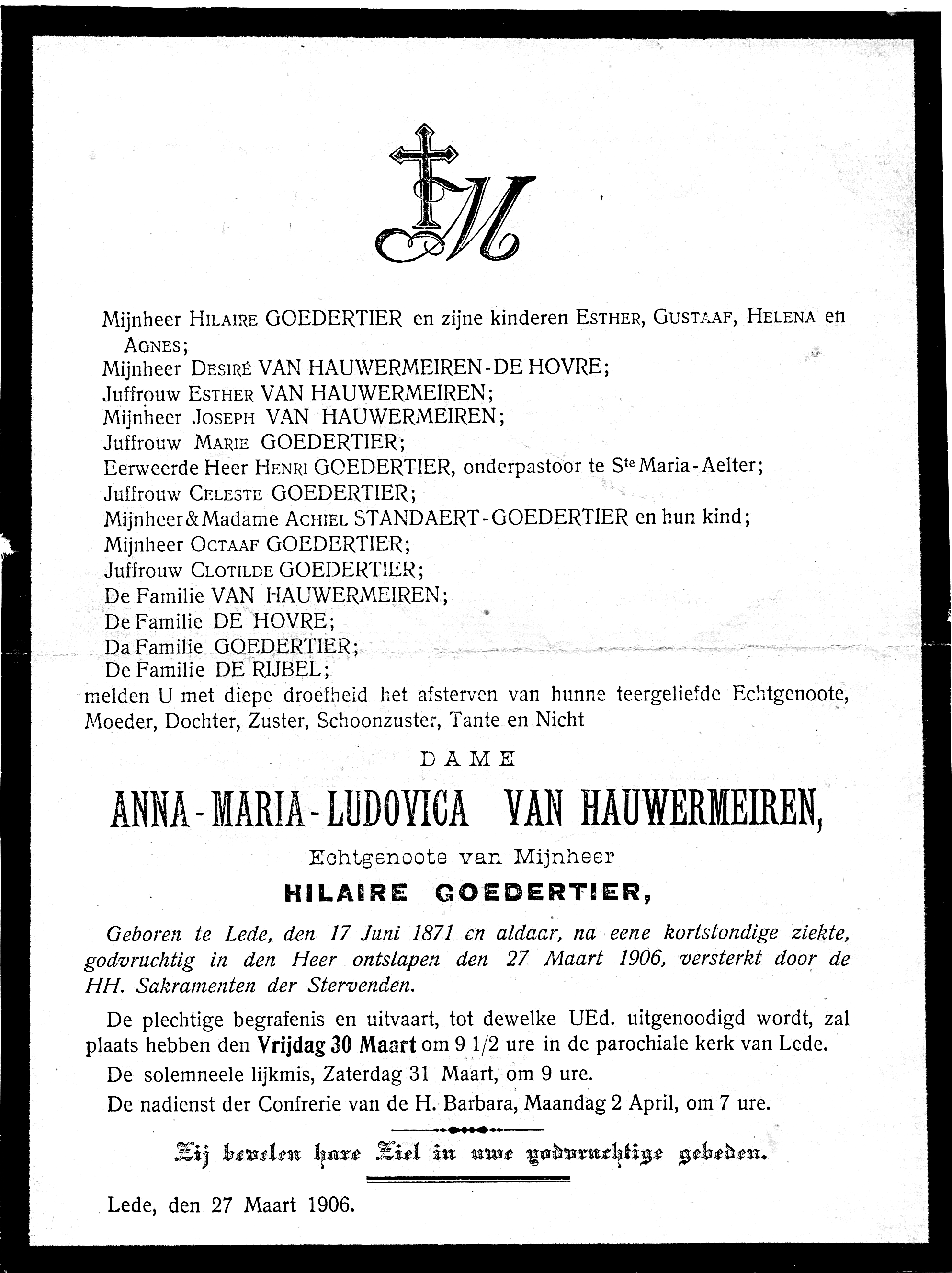 Begrafenis van een zus | Anna-Maria-Ludovica Van Hauwermeiren 30 maart 1906 (Leeftijd 39 jaar) |