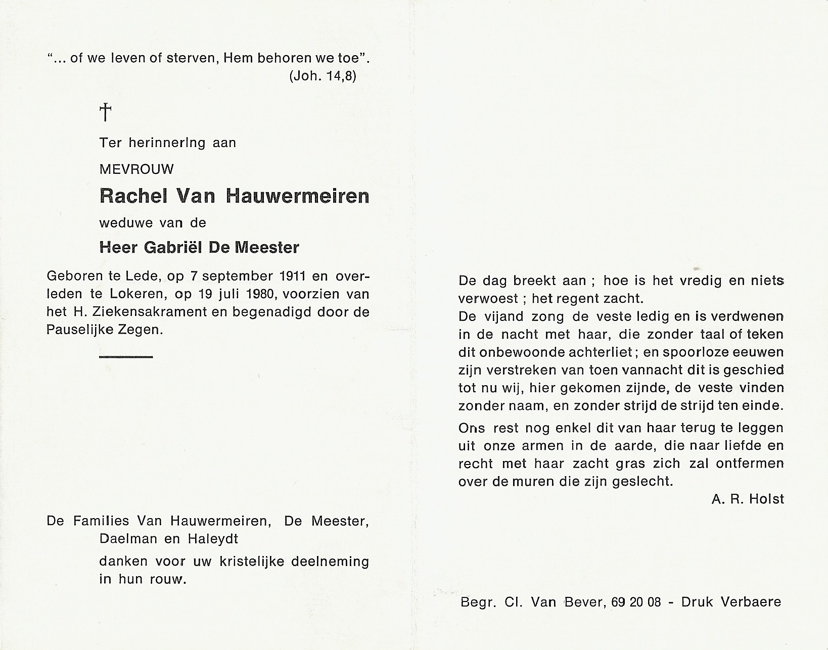 Rachel Van Hauwermeiren Geboren: 7 september 1911 35 27 — Lede Overleden: 19 juli 1980 — Lokeren |