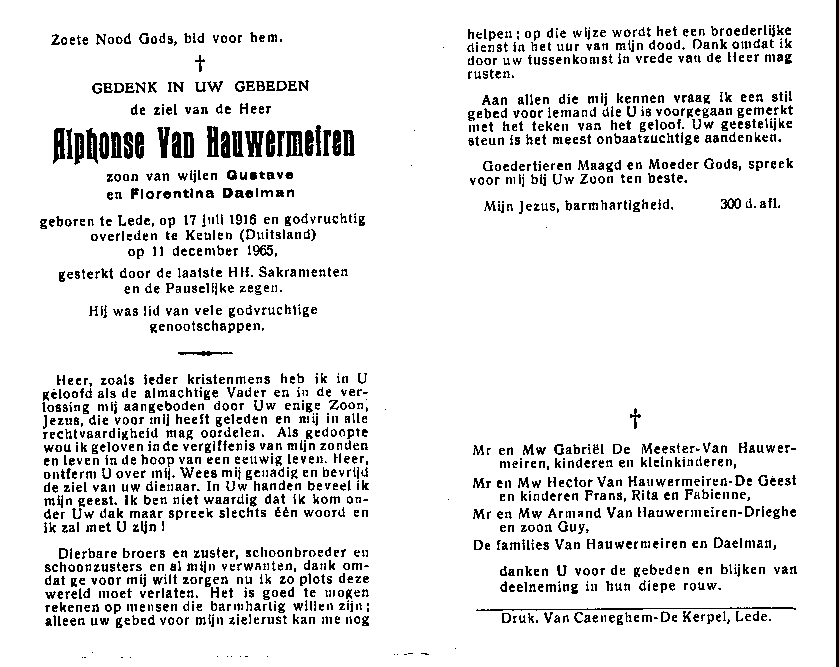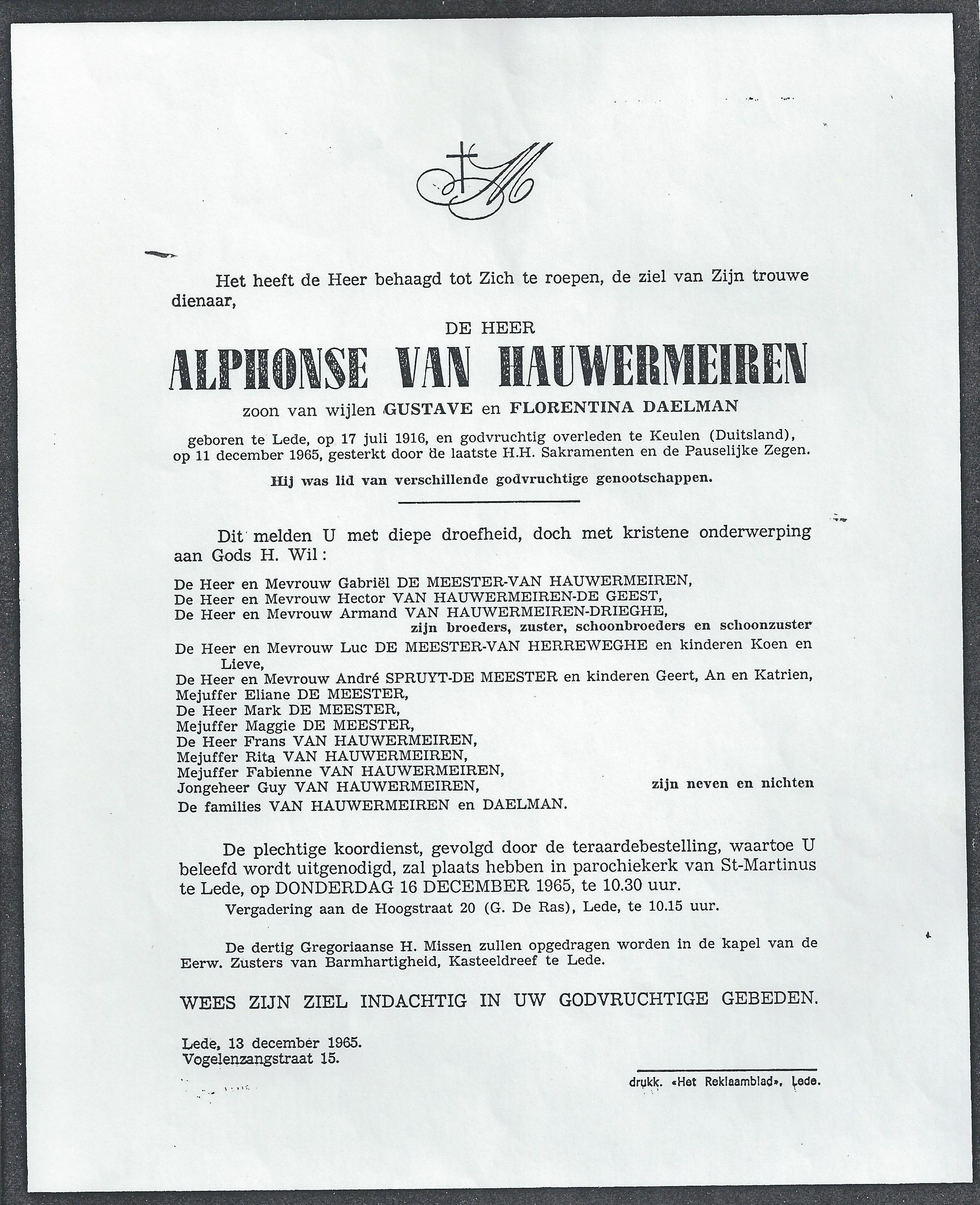 Overlijden van een broer | Alphonse Van Hauwermeiren 11 december 1965 (Leeftijd 54 jaar) |