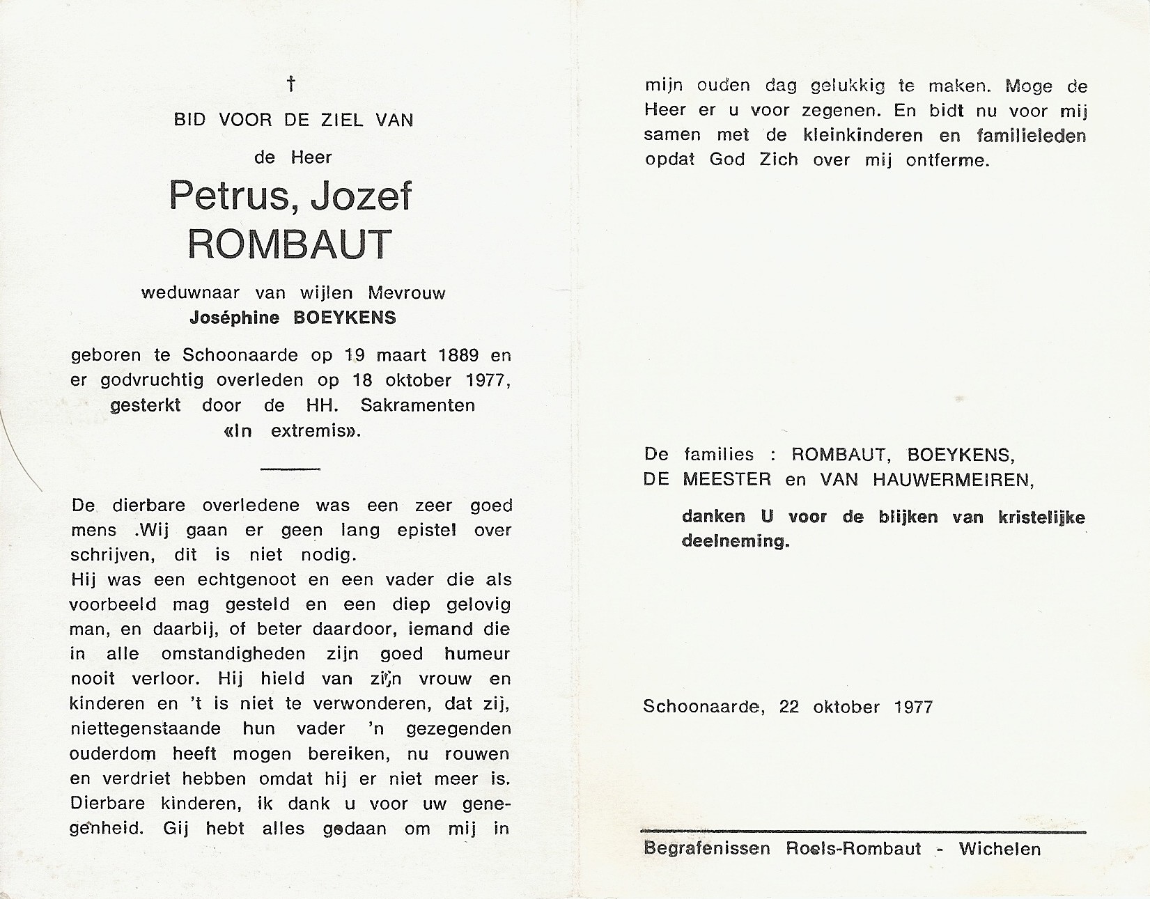Petrus Jozef Rombaut Geboren: 19 maart 1889 — Schoonaarde Overleden: 18 oktober 1977 — Schoonaarde |