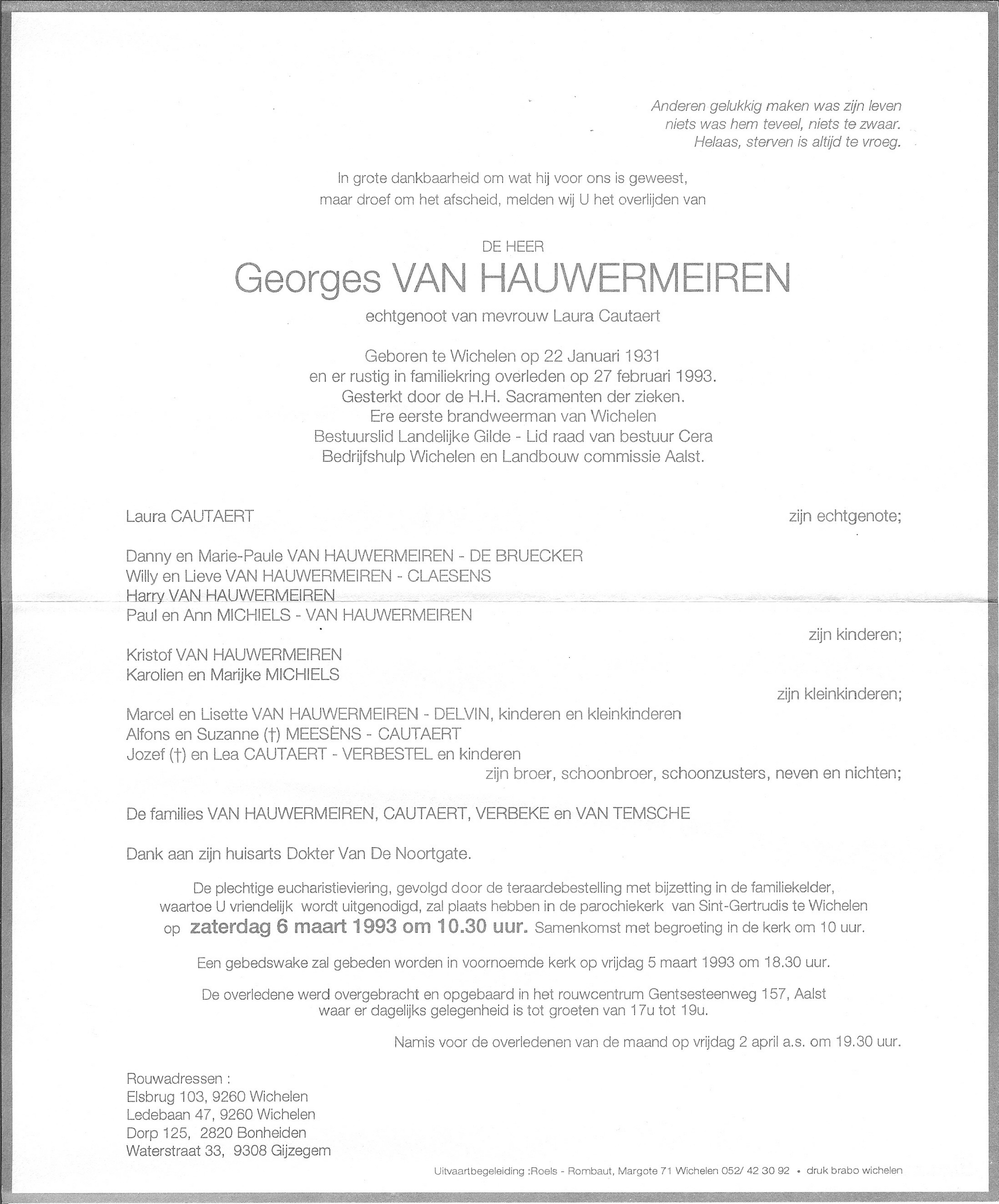 Begrafenis van vader | Georges Van Hauwermeiren 6 maart 1993 (Leeftijd 30 jaar) |