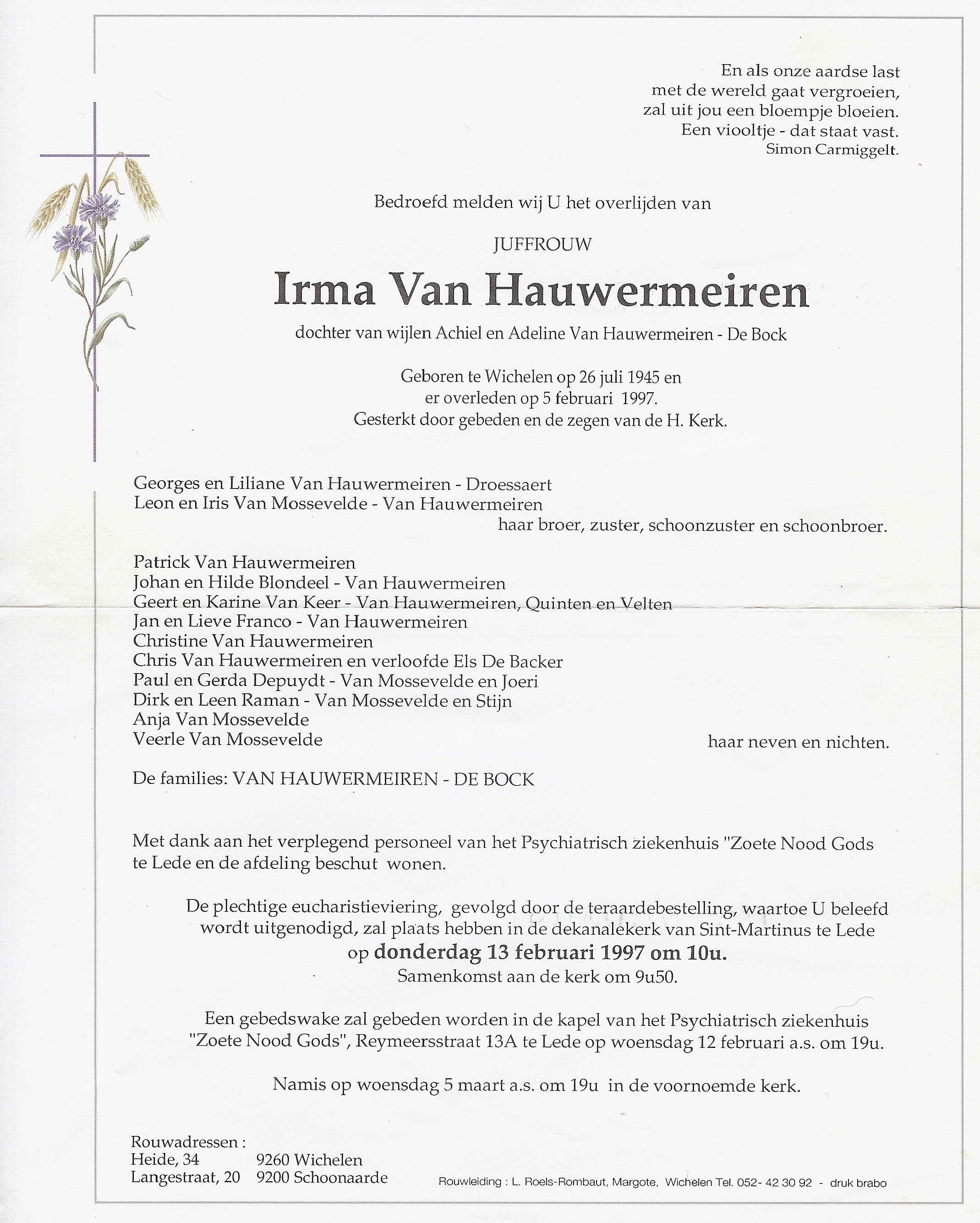 Geboren: 26 juli 1945 47 45 — Wichelen Overleden: 5 februari 1997 — Wichelen |