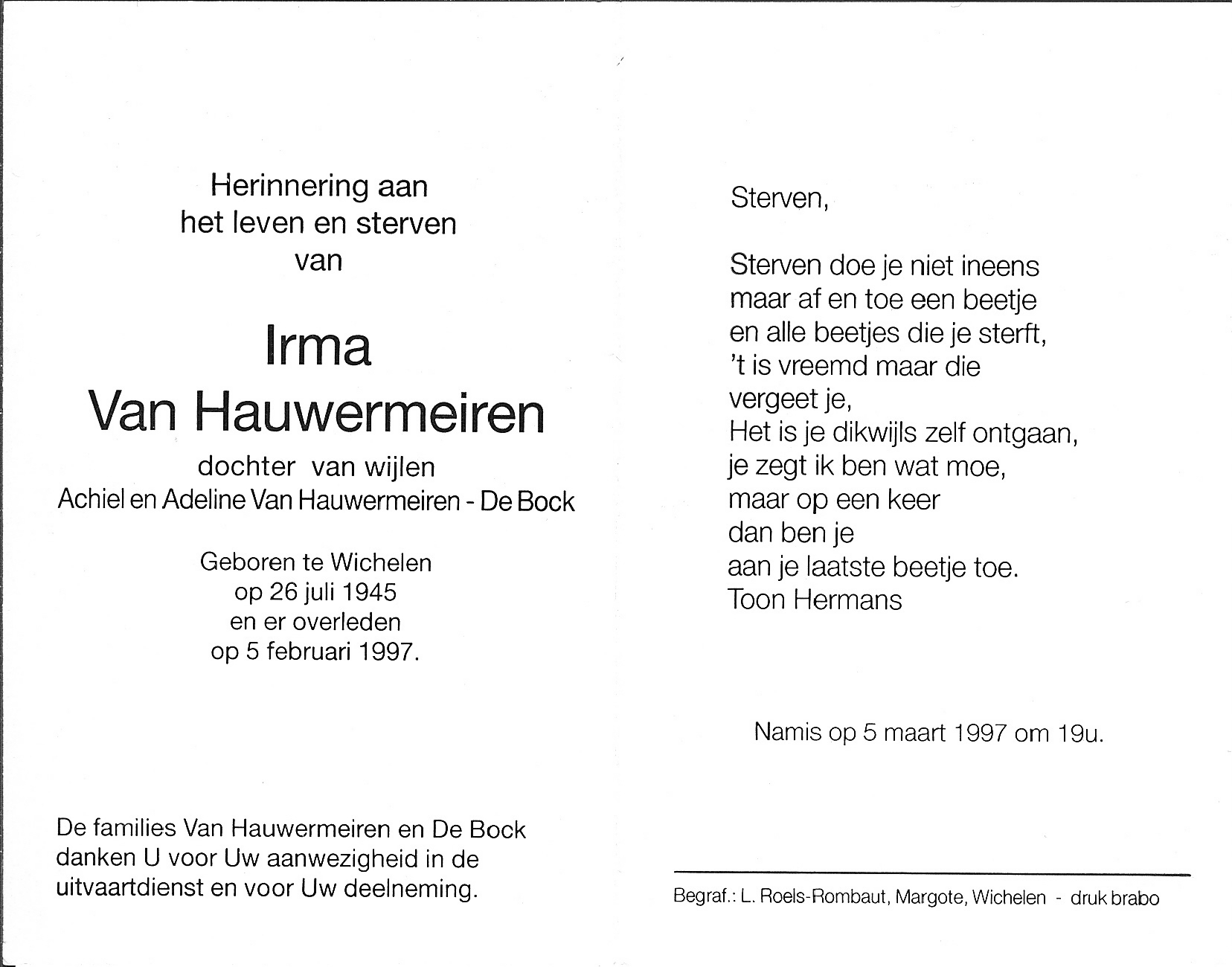 Irma Judith Van HauwermeirenLeeftijd: 51 jaar1945–1997