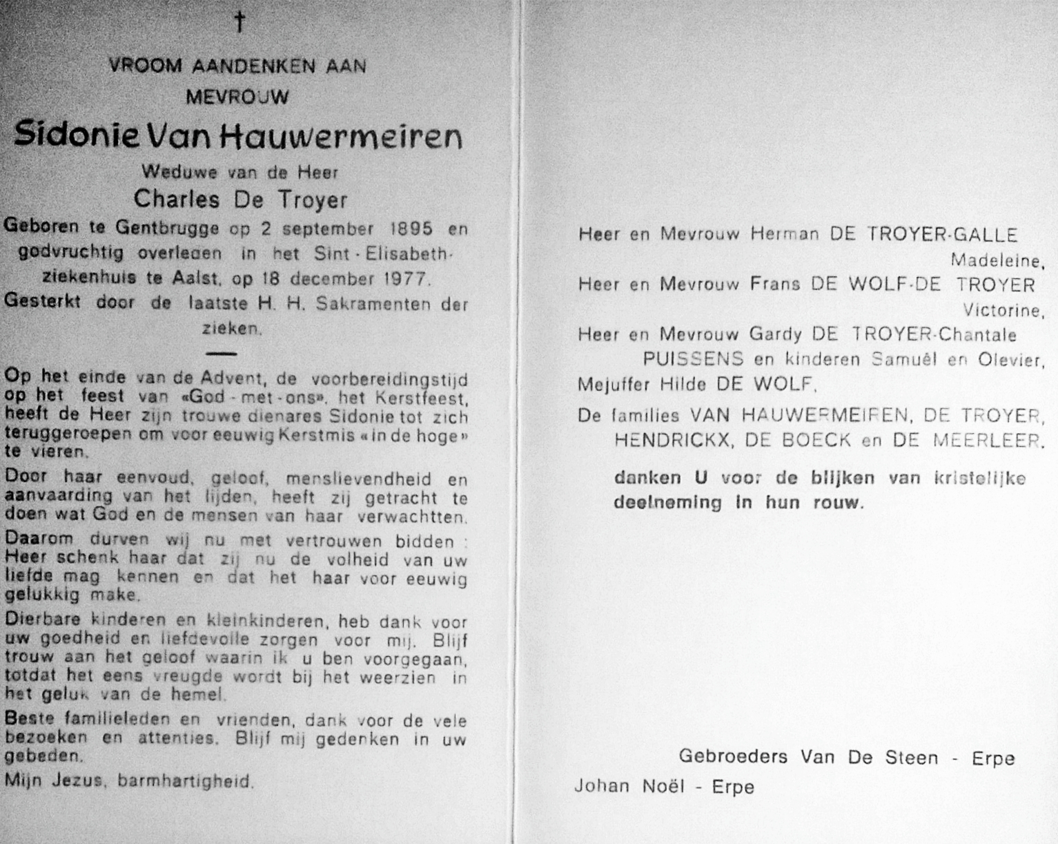 Sidonie Augustine Van Hauwermeiren Geboren: 2 september 1895 35 34 — Gentbrugge Overleden: 18 december 1977 — Aalst |