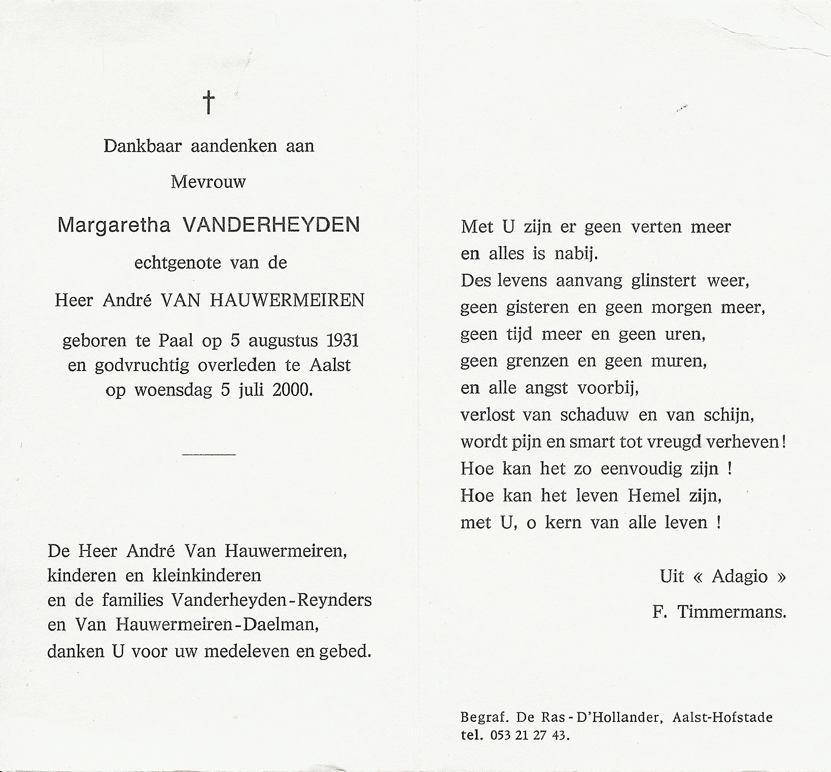 Margaretha Vanderheyden Geboren: 5 augustus 1931 — Paal Overleden: 5 juli 2000 — Aalst |