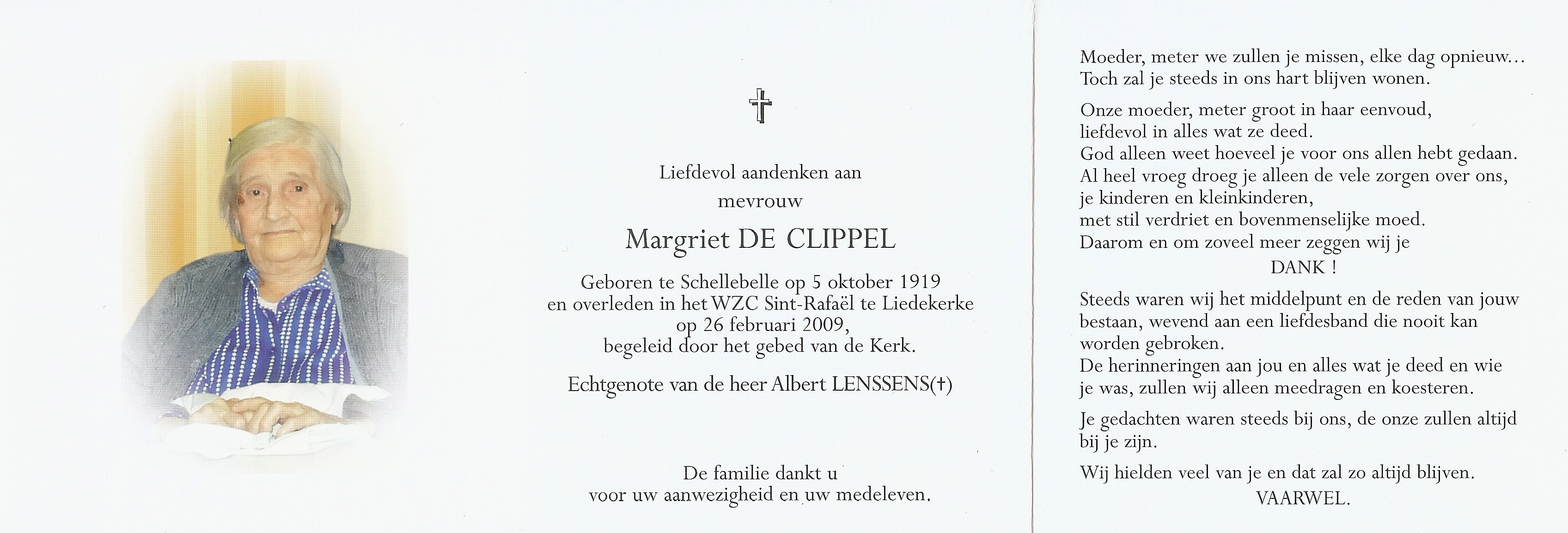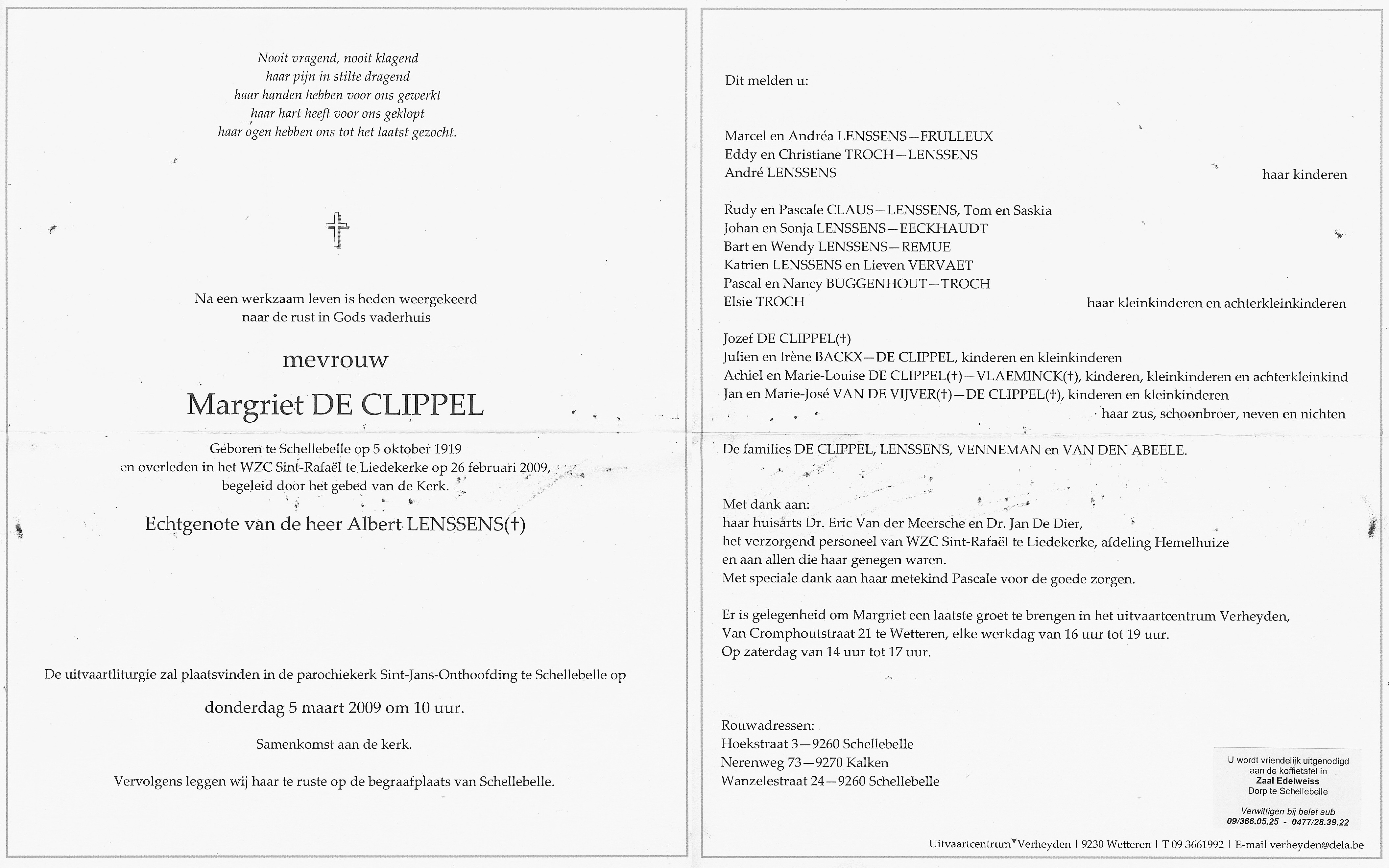 Margriet De Clippel Geboren: 5 oktober 1919 31 22 — Schellebelle Overleden: 26 februari 2009 — Liedekerke |