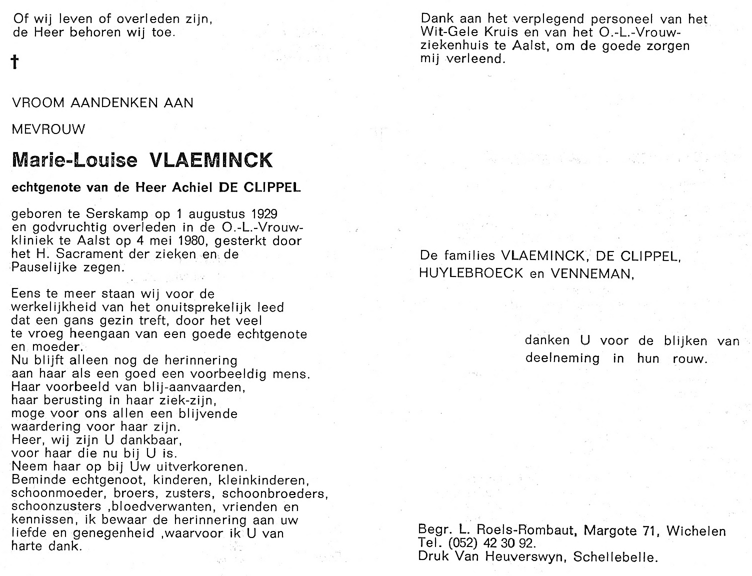 Marie-Louise Vlaeminck Geboren: 1 augustus 1929 — Serskamp Overleden: 4 mei 1980 — Aalst |