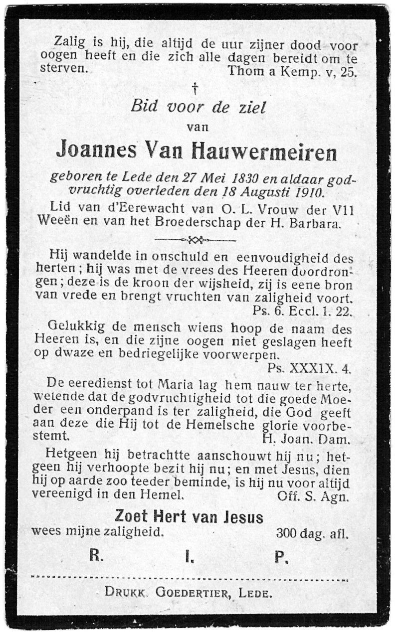 Pieter Joannes Van Hauwermeiren Geboren: 27 mei 1830 28 30 — Lede Overleden: 18 augustus 1910 — Lede |