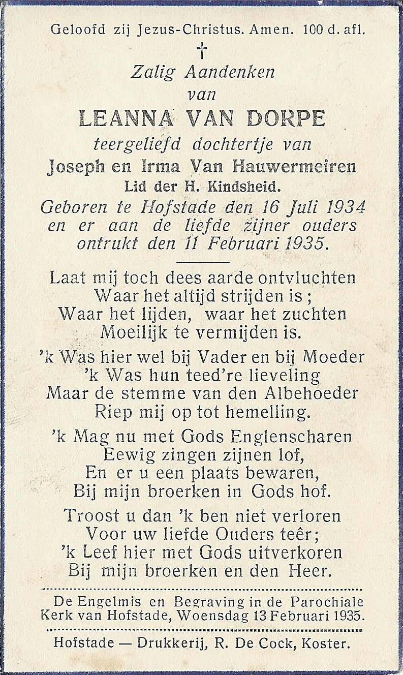 Leanna Van Dorpe Geboren: 16 juli 1934 39 35 — Hofstade Overleden: 11 februari 1935 — Hofstade |
