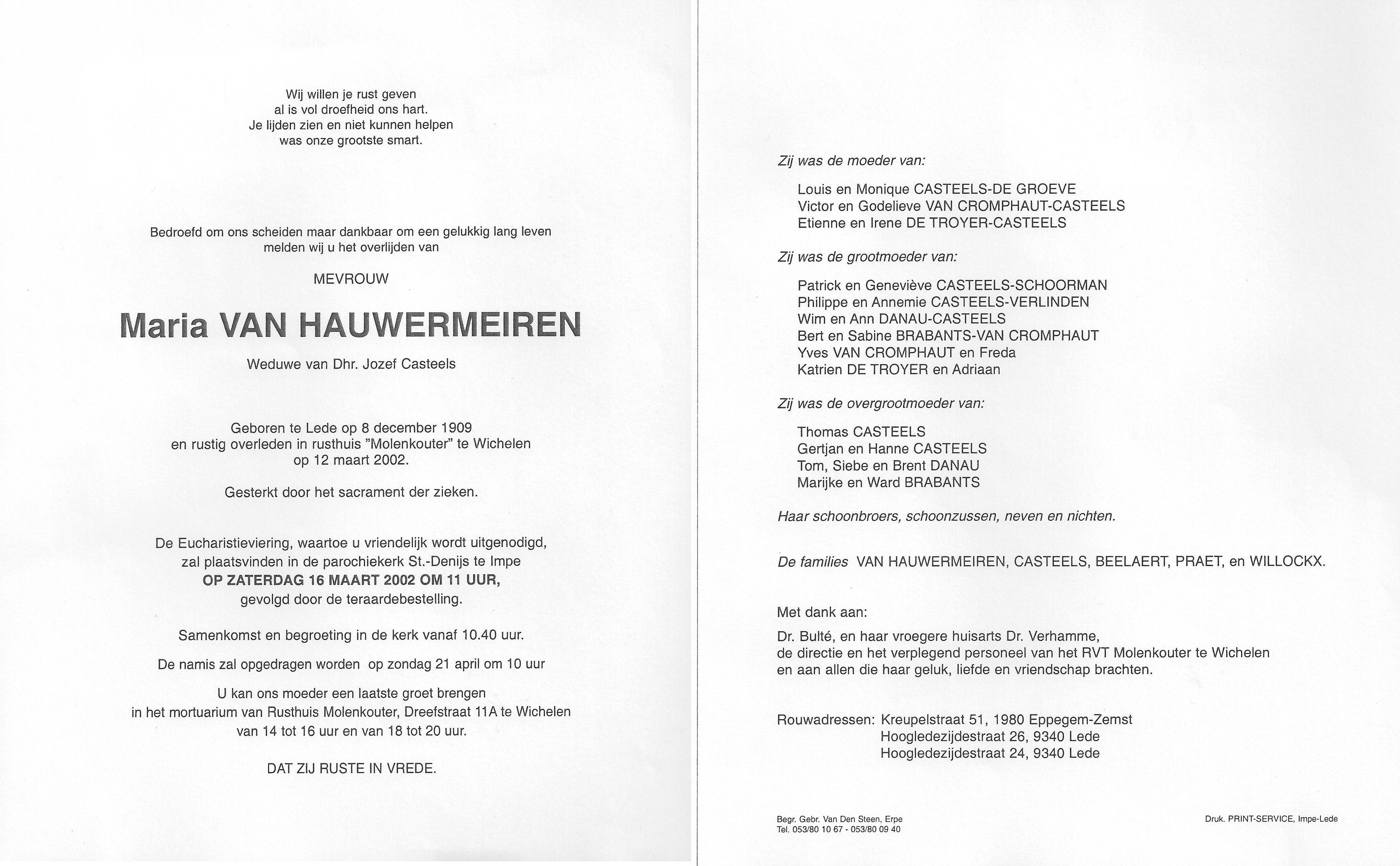 Maria Van Hauwermeiren Geboren: 8 december 1909 36 31 — Lede Overleden: 12 maart 2002 — Wichelen |