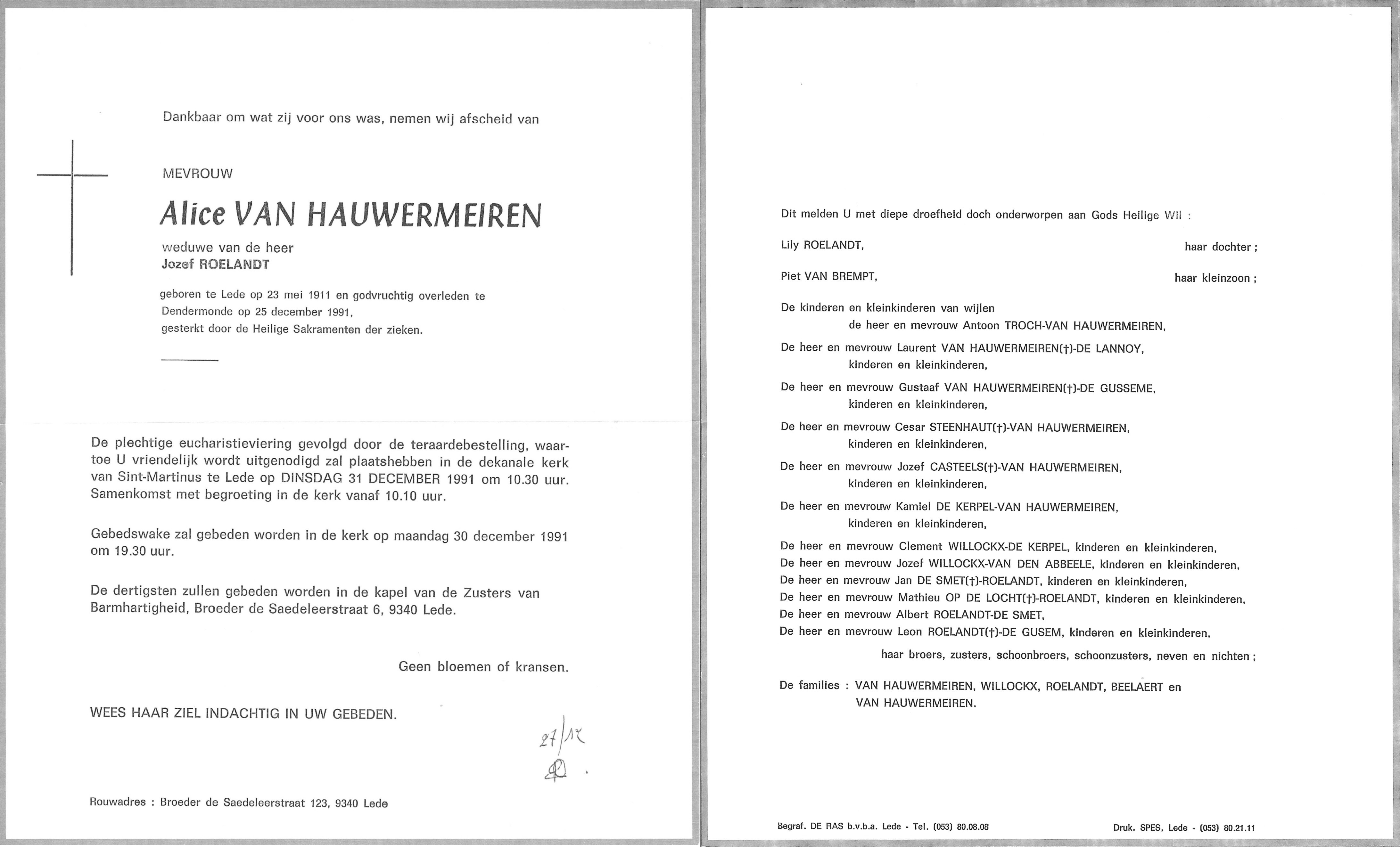 Odila Alicia Van Hauwermeiren Geboren: 23 mei 1911 38 33 — Lede Overleden: 25 december 1991 — Dendermonde |