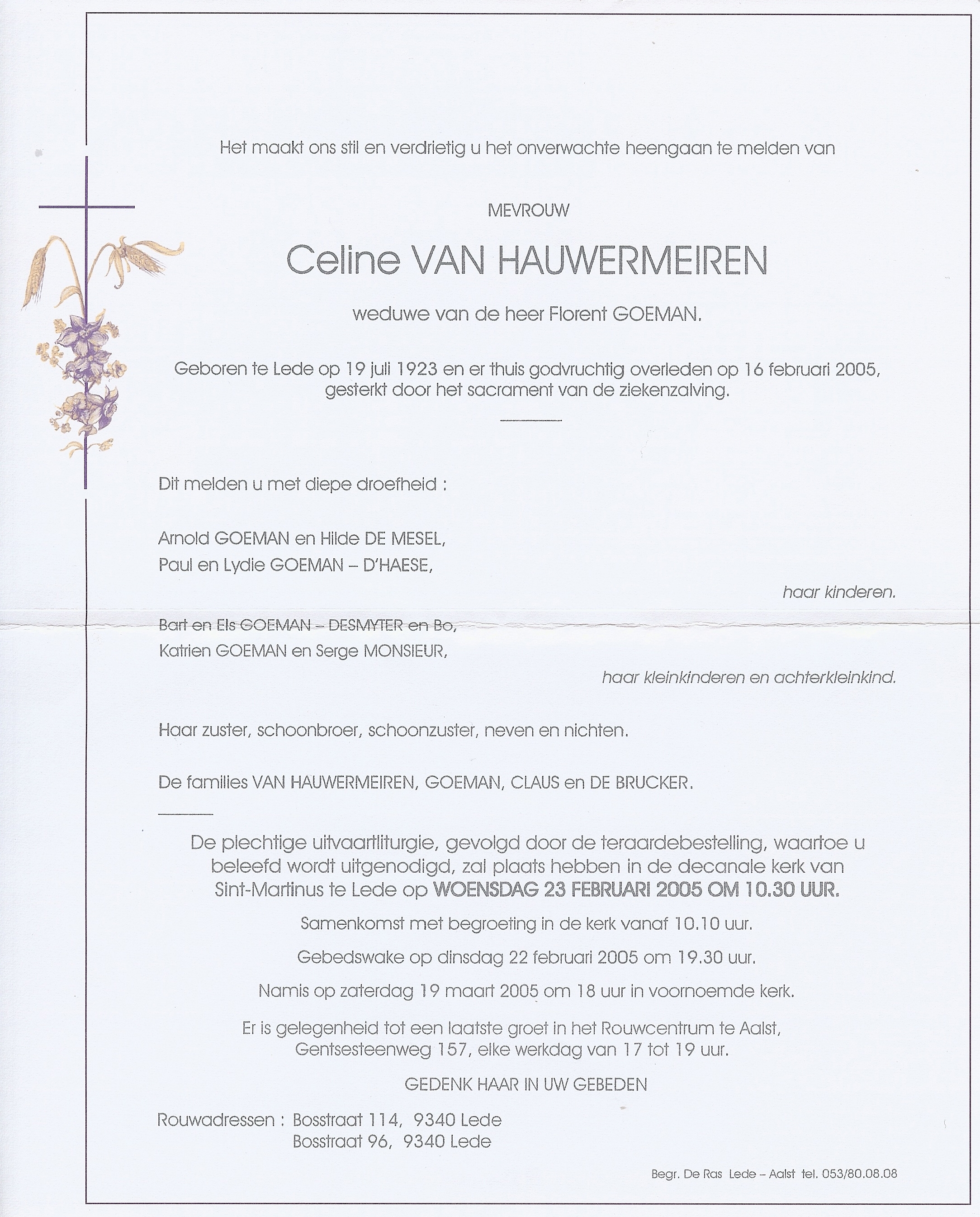 Begrafenis van een zus | Celine Leontine Van Hauwermeiren 23 februari 2005 (Leeftijd 83 jaar) |