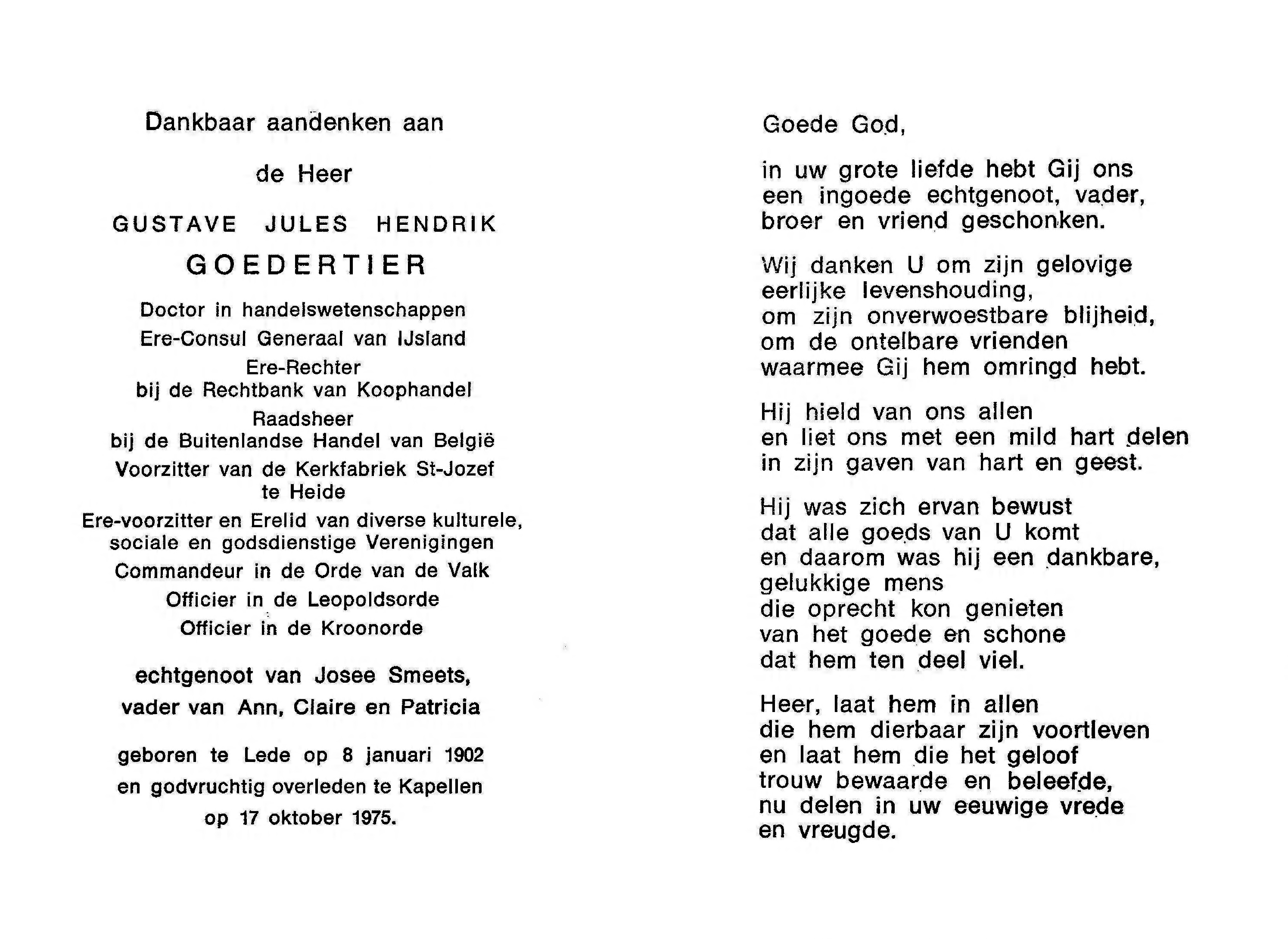 Overlijden van een broer | Gustave Jules Hendrik Goedertier 17 oktober 1975 (Leeftijd 72 jaar) |