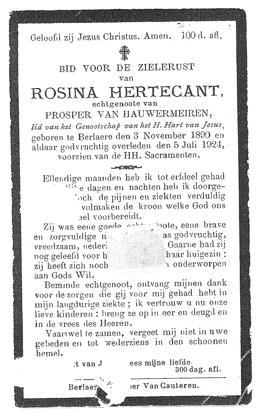 Rosina Hertecant Geboren: 3 november 1890 — Berlare Overleden: 5 juli 1924 — Berlare |