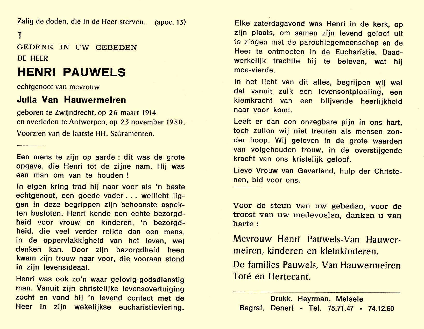 Henri Pauwels Geboren: 26 maart 1914 — Zwijndrecht Overleden: 23 november 1980 — Antwerpen |
