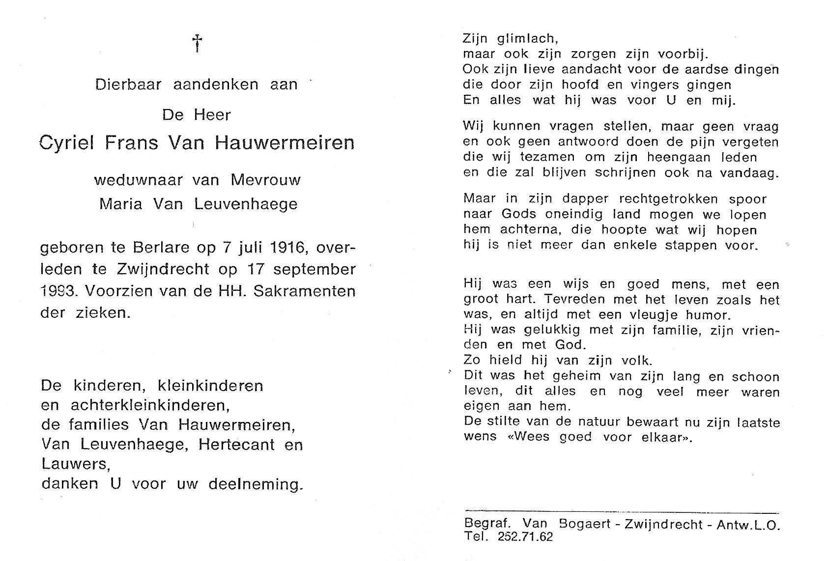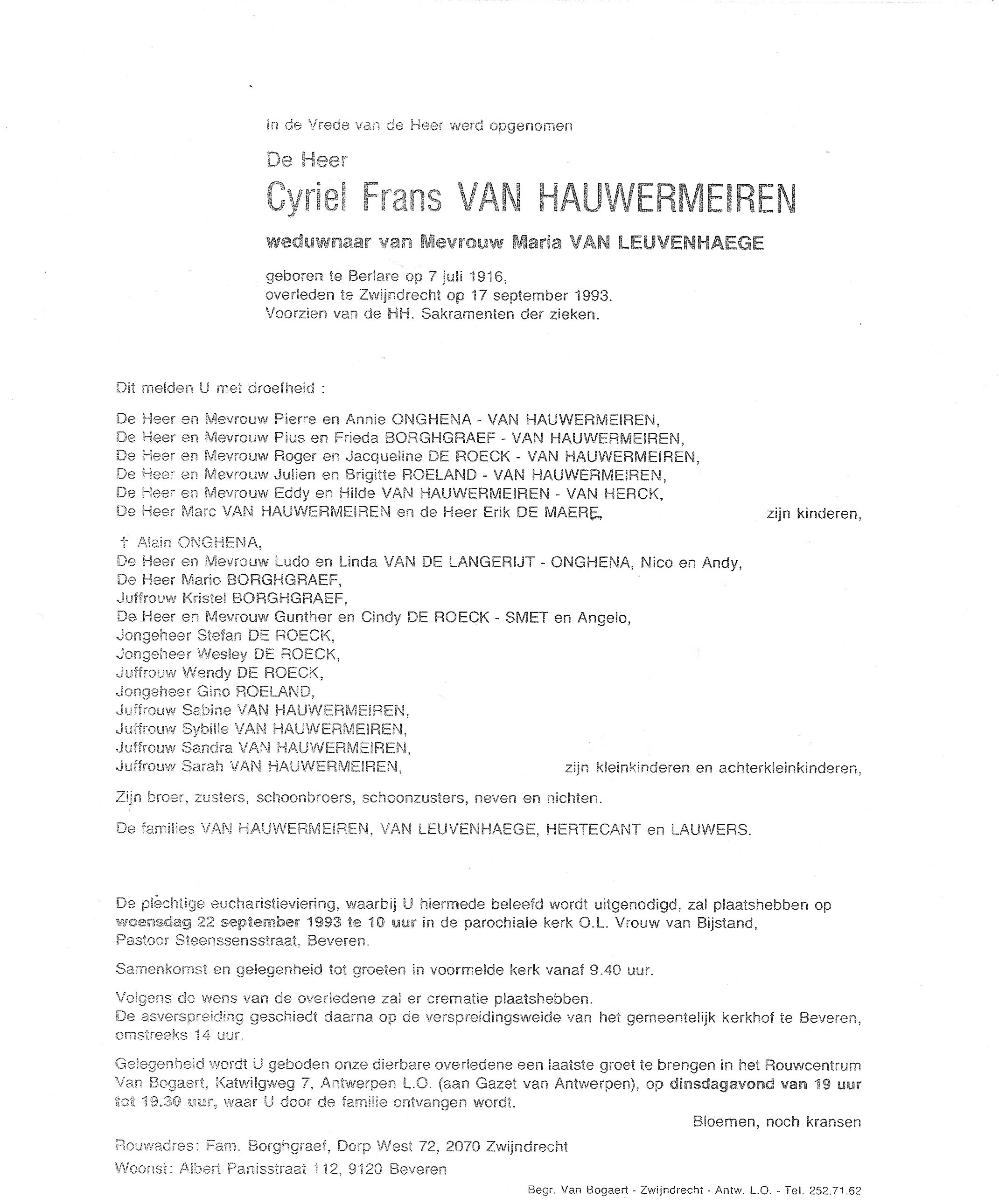 Begrafenis van een broer | Cyriel Frans Van Hauwermeiren 22 september 1993 (Leeftijd 73 jaar) |