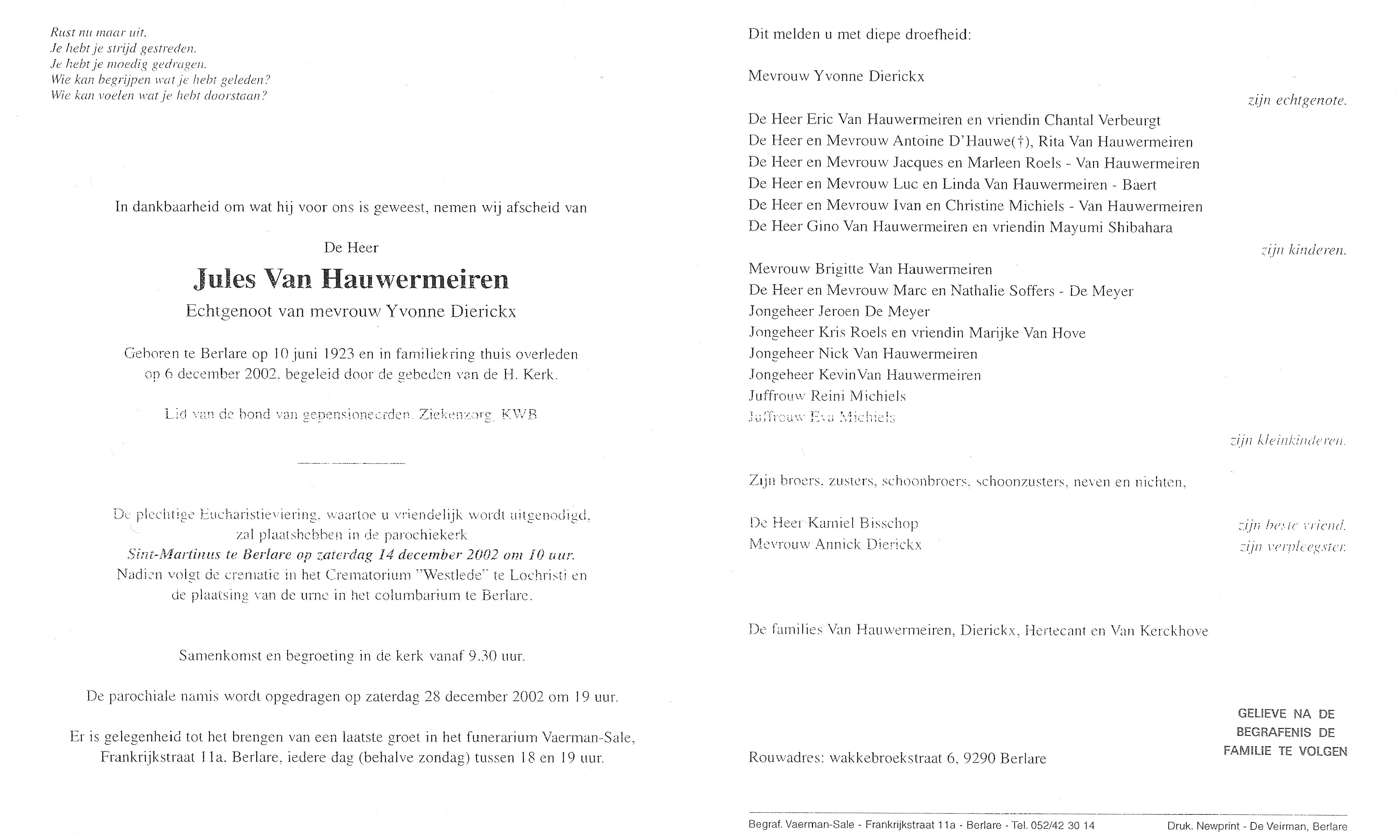 Begrafenis van een broer | Jules Van Hauwermeiren 14 december 2002 (Leeftijd 82 jaar) |