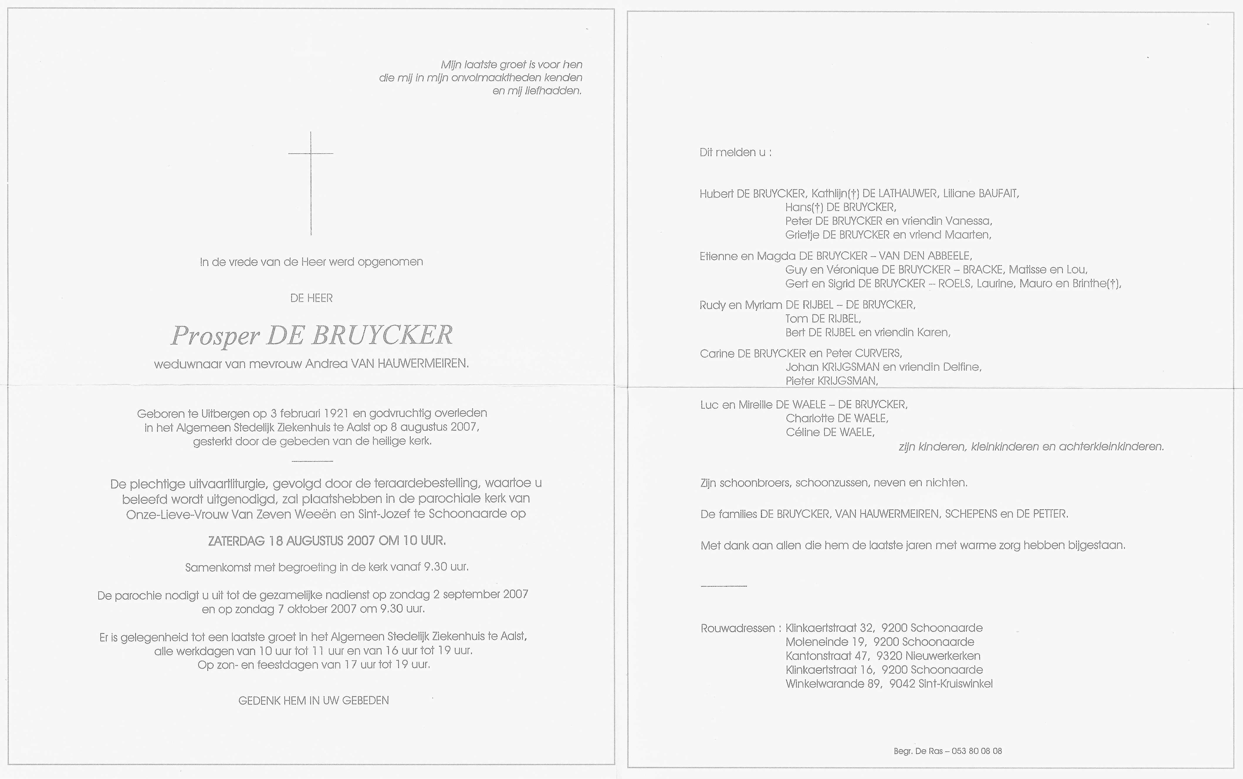 Begrafenis van een echtgenote | Andrea Van Hauwermeiren 27 mei 2006 (Leeftijd 85 jaar) |