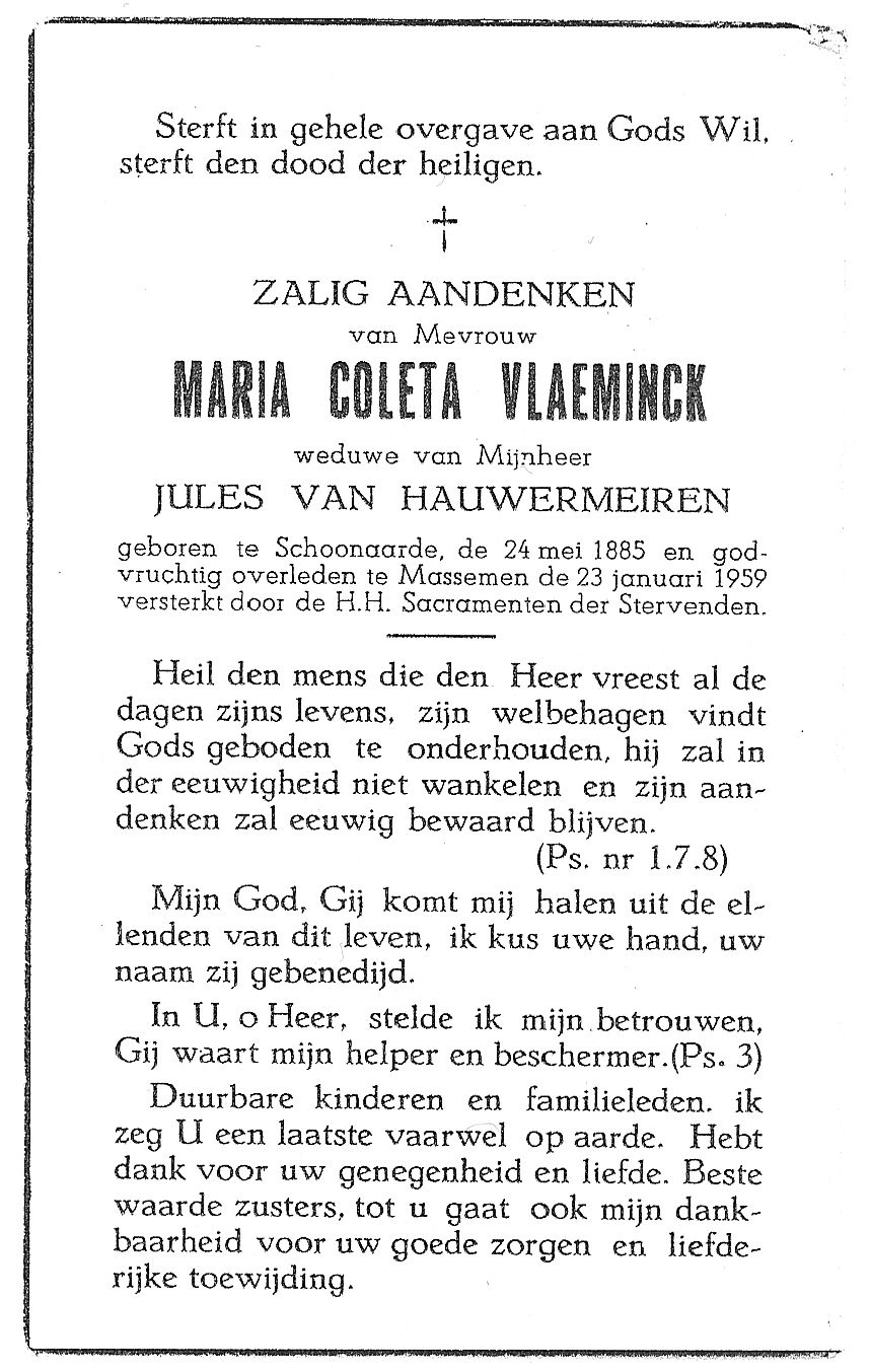Maria Coleta Vlaeminck Geboren: 24 mei 1885 — Schoonaarde Overleden: 23 januari 1959 — Massemen |